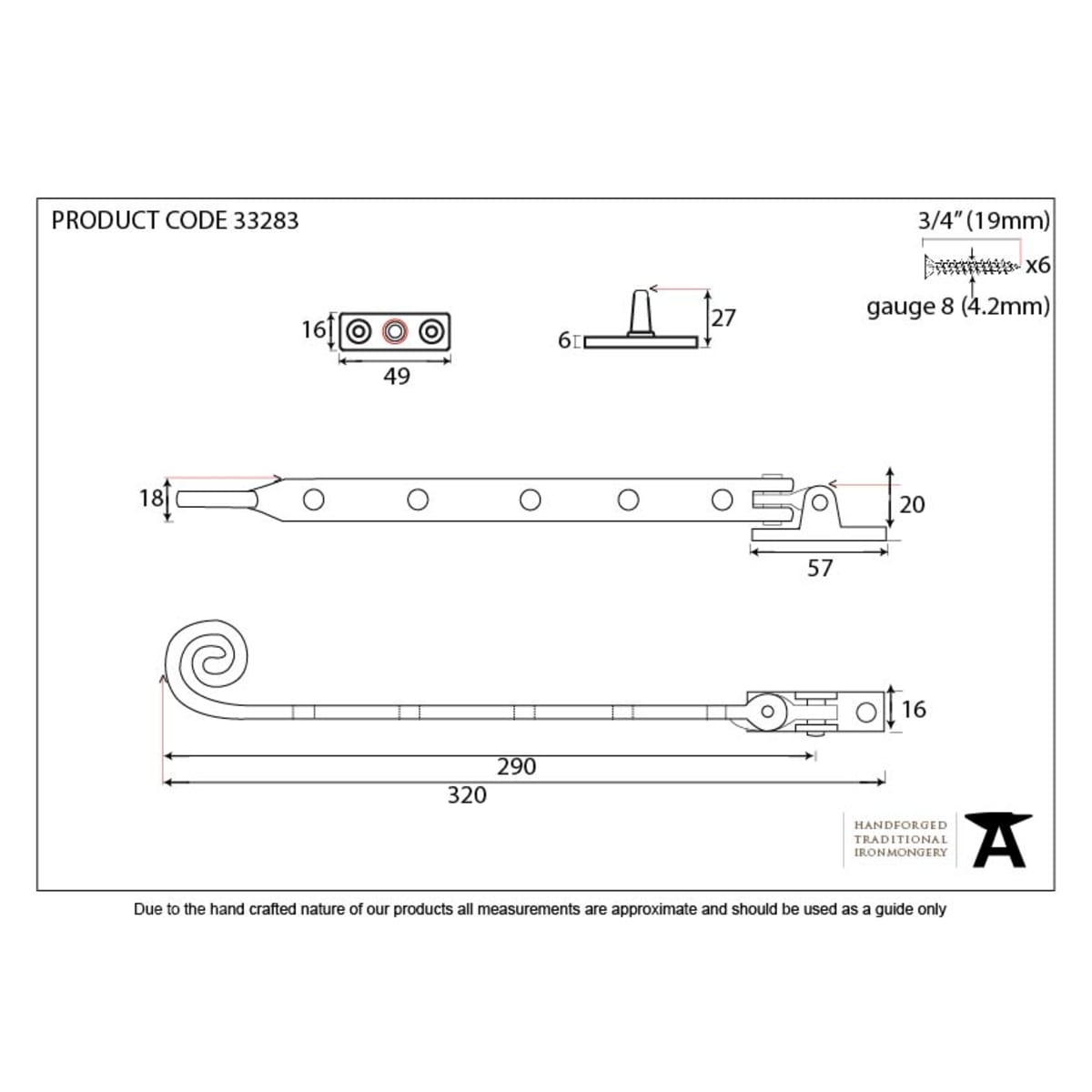 Our talented Blacksmiths heat and delicately hammer a thin piece of mild steel to form the curly, Monkeytail shape of this lever handle. One of our most traditional designs. Overall Length: 320mm Stay Arm: 290mm Fixing Plate: 57mm x 16mm