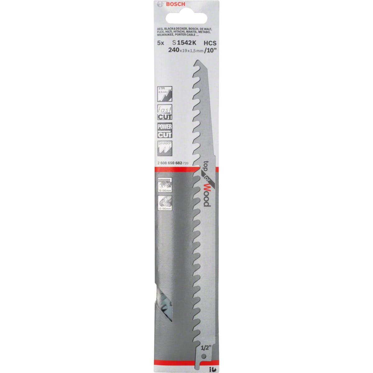 IDTM115832 Tools, Equipment & Signage > Power Tool Accessories > Cutting & Blades > Bosch S1542K Sabre Saw Blades 240 x 19 x 1.5mm Silver Pack of 5