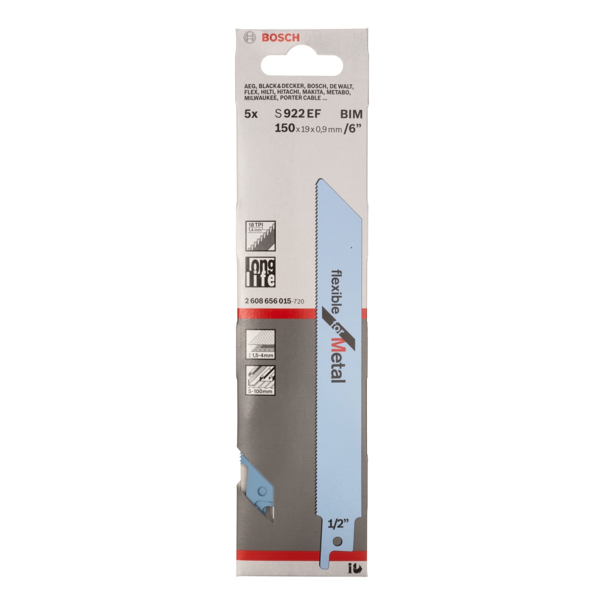 IDTABSH040 Tools, Equipment & Signage > Power Tool Accessories > Cutting & Blades > Bosch S922EF Sabre Blades 150 x 19 x 0.9mm Blue Pack of 5