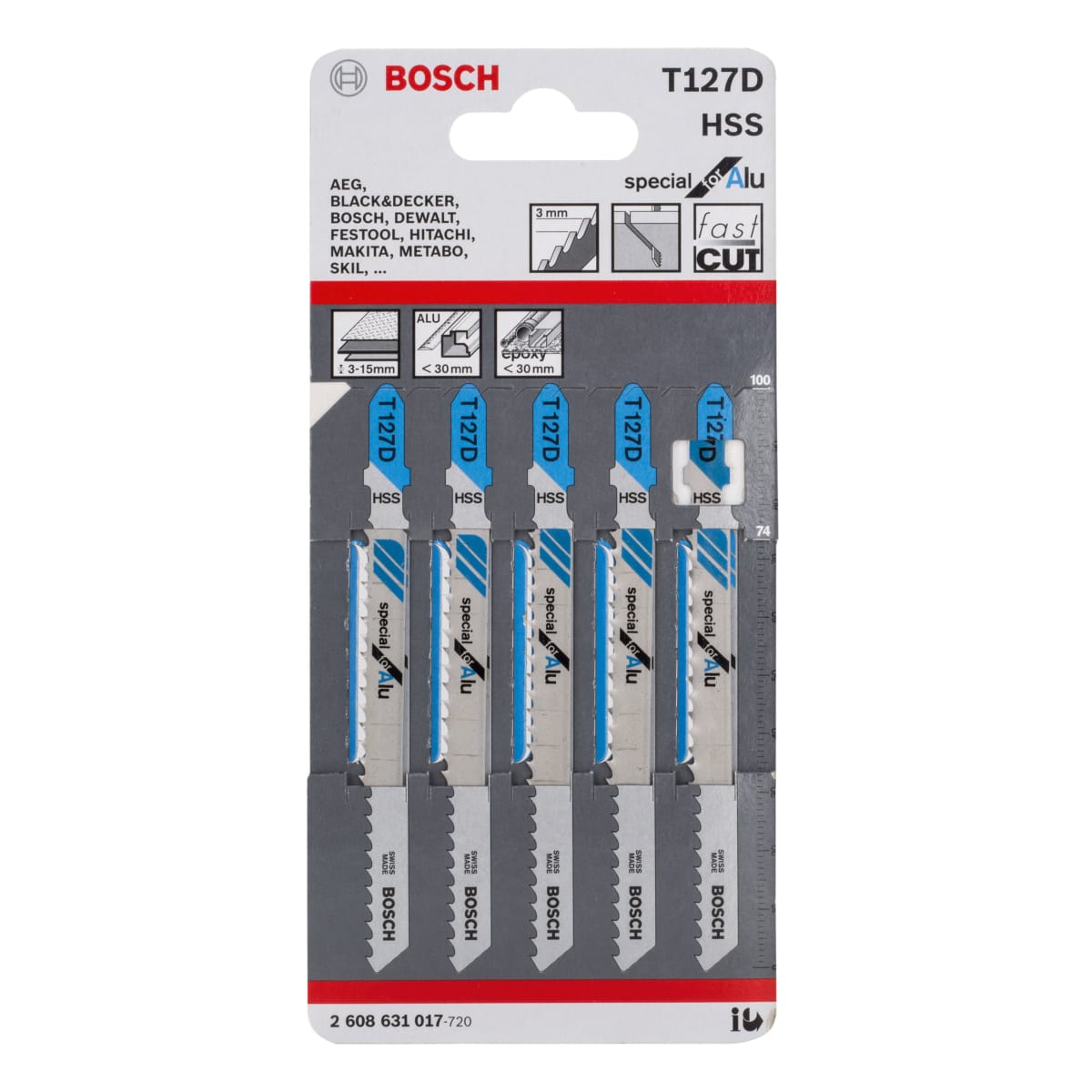 IDTM115680 Tools, Equipment & Signage > Power Tool Accessories > Cutting & Blades > Bosch T127D HSS Jigsaw Blades 100mm Length Blue Pack of 5