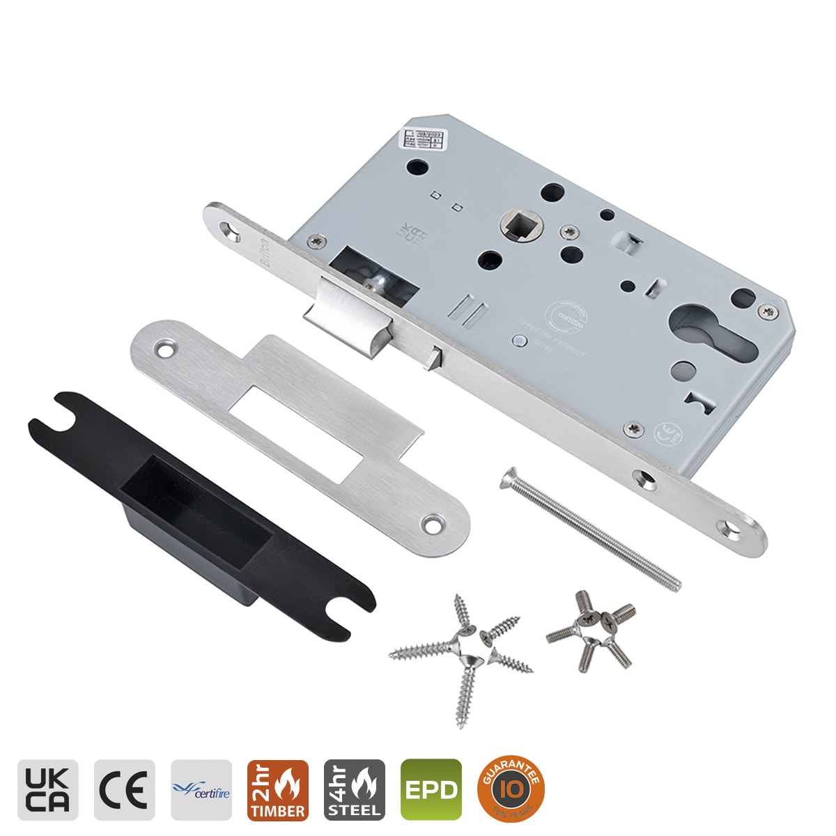 IDIRGB3876 Locks & Security > Locks, Latches & Cylinders > Nightlatches > BRITON 5750.60.R.SS Euro Profile Cylinder Nightlatch-Radius Forend Satin Stainless Steel