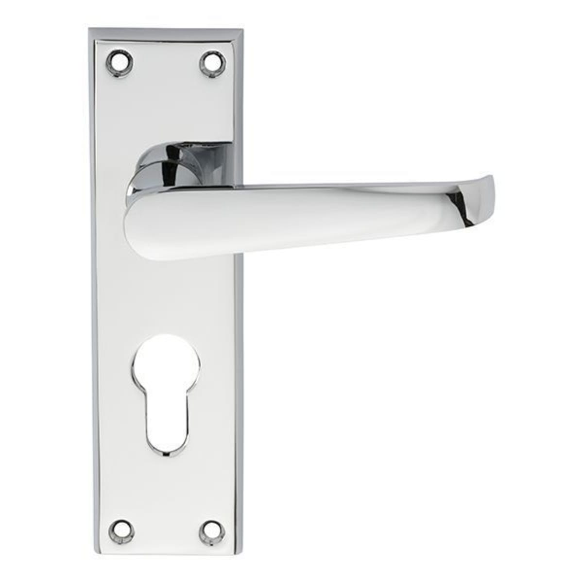 Lever on lock backplate. Euro profile 47.5mm c/c. Plain rectangular backplate. A Victorian style straight lever with a slight inward curve at the end providing an element of safety A classic handle with its clean and simple lines conveying its traditional heritage. Graceful and elegant.