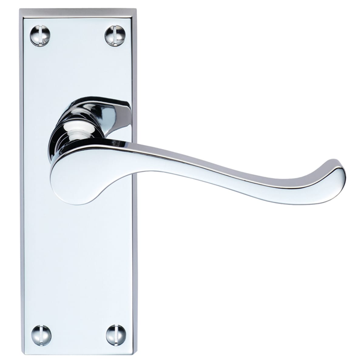 Carlisle Brass Contract Victorian Scroll Latch in a polished chrome finish is a fire resistant handle that is suitable for interior and exterior doors. This door handle is slightly bent at the end to aid grip is fixed on a straight backplate with corners. The handles feature a comfortable gently curved lever handle with smooth spring action. The plain rectangular backplate is a classic scroll lever with its clean and simple lines conveying its traditional heritage. It can be fixed with four screws at different corners and is suitable for internal doors. This product is supplied in a pack that includes a pair of handles, hinges and a tubular latch.