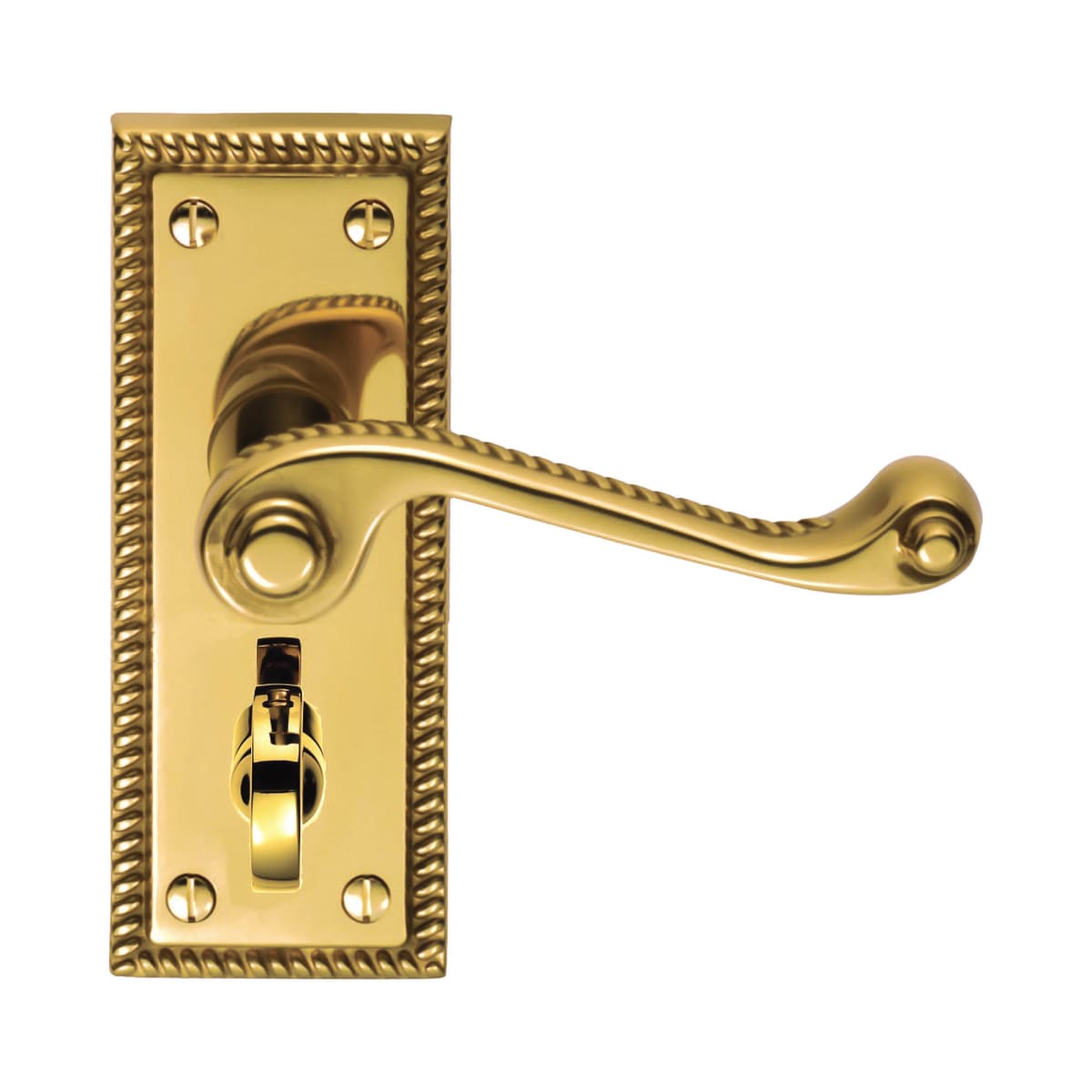 Carlisle Brass Georgian Lever on Privacy Backplate 112 x 48 x 10mm (H x W x T) Polished Brass has four face fixing points for an easy fitting. It is the straight lever on a rectangular backplate with end inserts top and bottom emphasizing the polished brass finish. The classic scroll lever set is built-in with the traditional georgian rope design adorning the perimeter the top of the lever. The smooth rounded lever is narrowing slightly in the middle for an easy grip. The product is fire door rated.