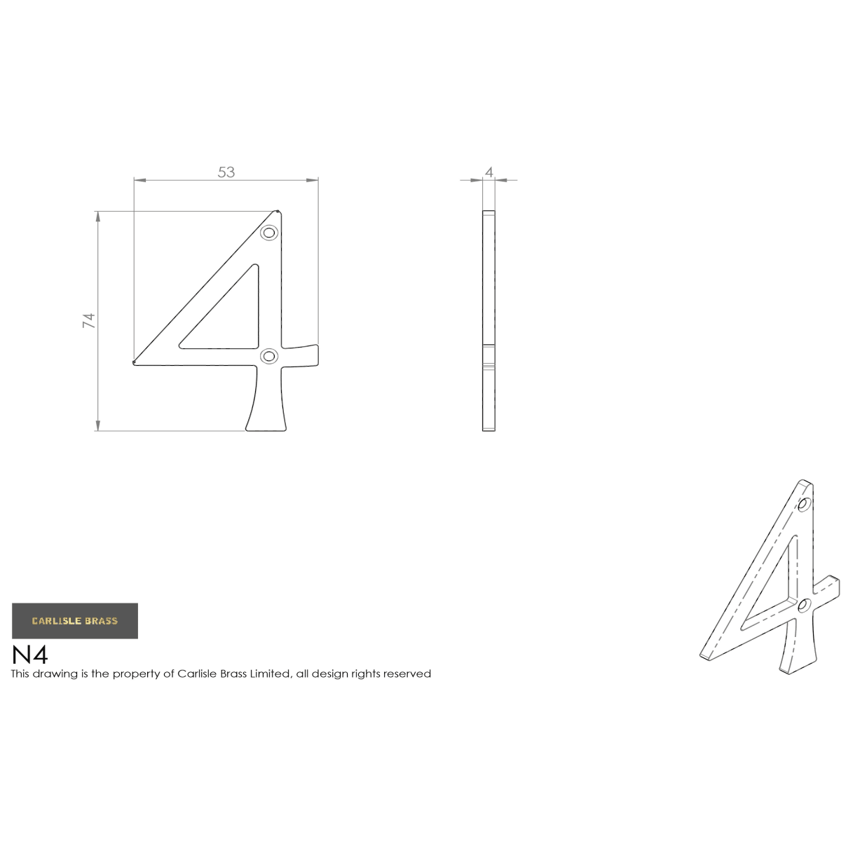Carlisle Brass Numeral '4' Face Fix Number 74 x 53 x 4mm (L x W x T) Satin Chrome is an external door numeral. The face fix number is used to notify what post number the house is. The round ended type face provides clarity at a distance.