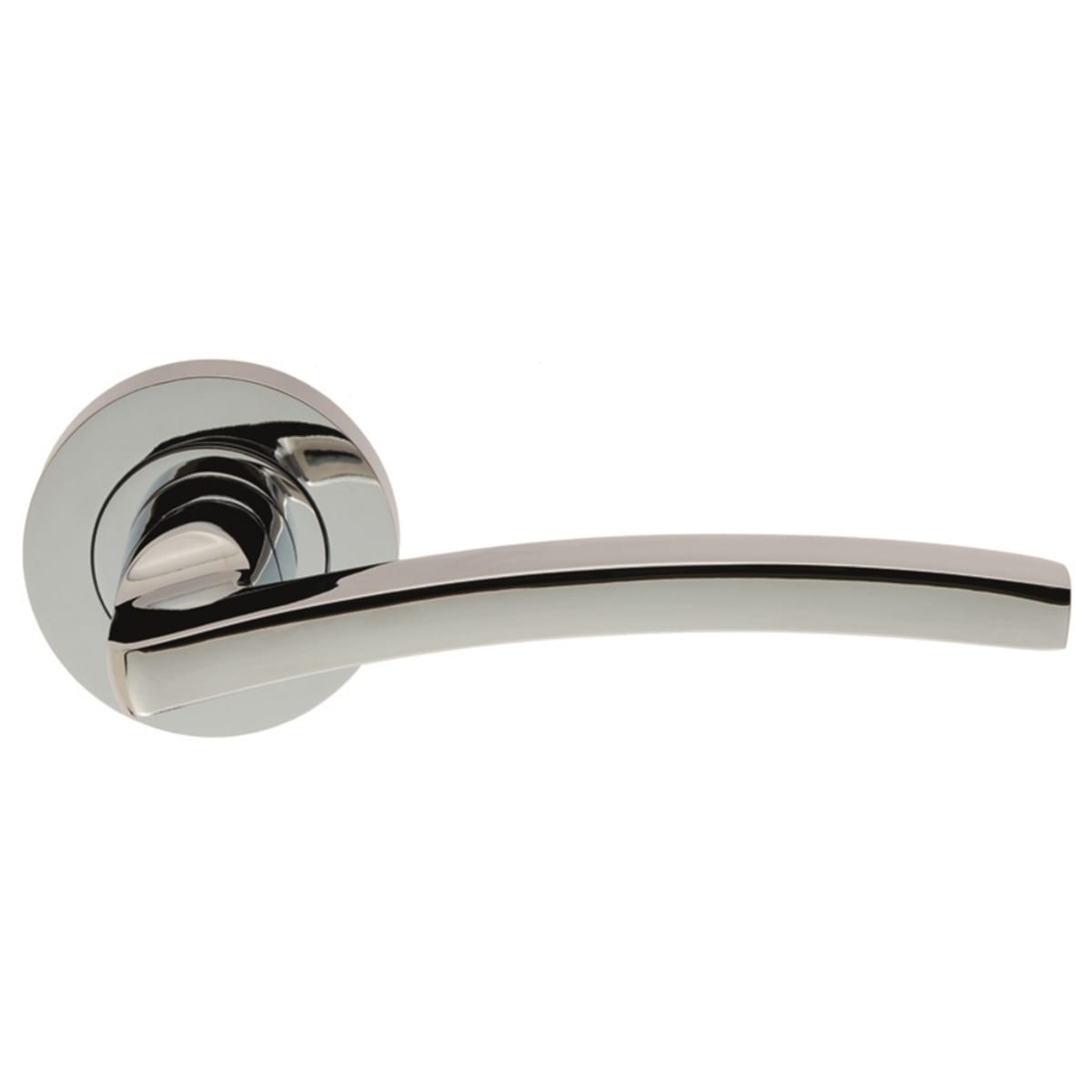 Tavira Designer lever latch handle pack includes a pair of Tavira lever handles, a pair of ball bearing butt hinges and a bolt through tubular mortice latch. The Tavira design is a curved square lever on a round rose. Finish Chrome Plated.