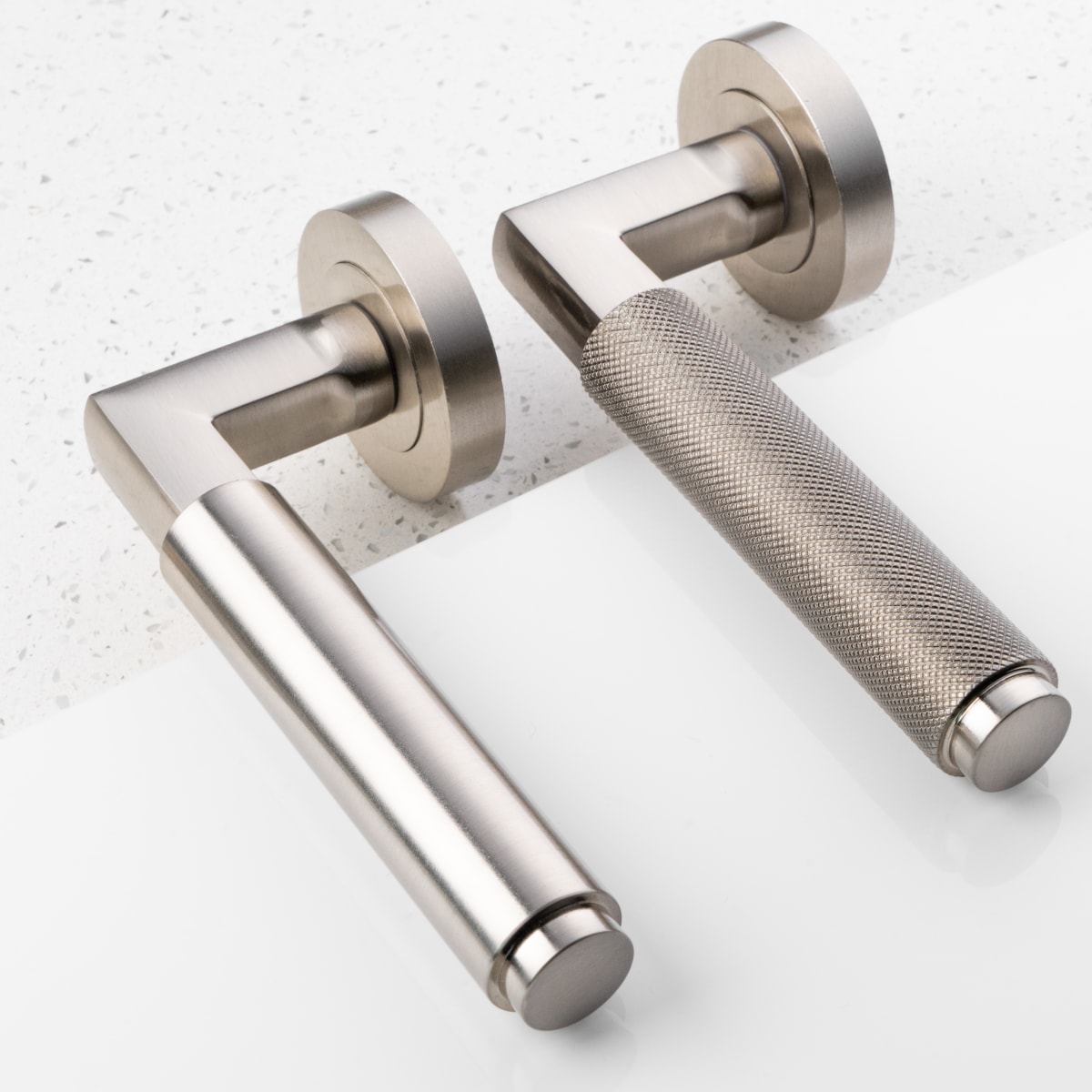 Terazzo Lever on a concealed fix 2 part screw on round rose. A stylish knurled for grip round bar lever. Comes with a 25 year mechanical guarantee and is Fire door rated. Suitable for domestic and commercial use.