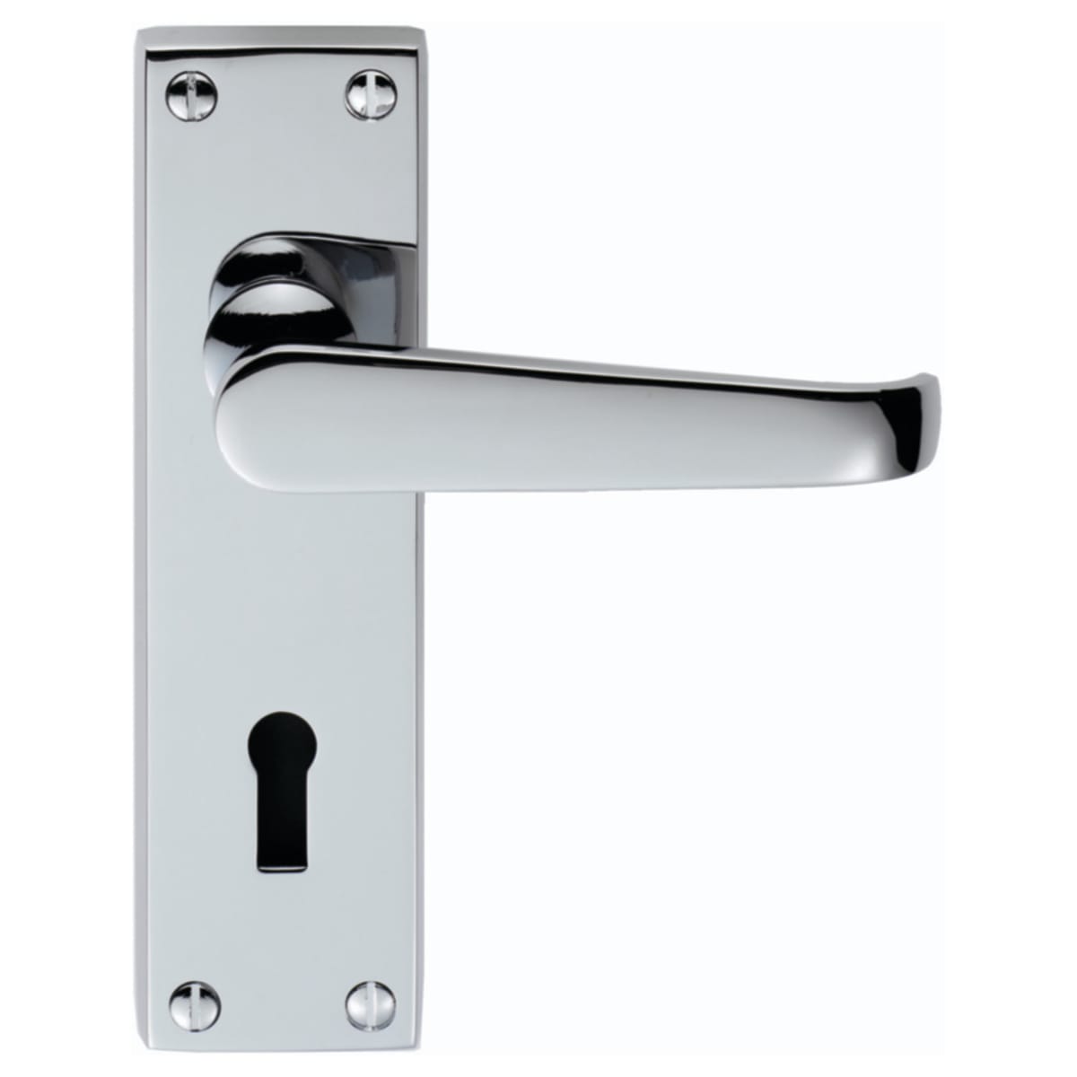 Carlisle Brass Victorian Lever on Lock Backplate 150 x 43 x 10mm (L x W x T) Polished Chrome is designed with traditional Victorian styled handle. It is a straight shaped lever that curves round at the end for ergonomic use.
