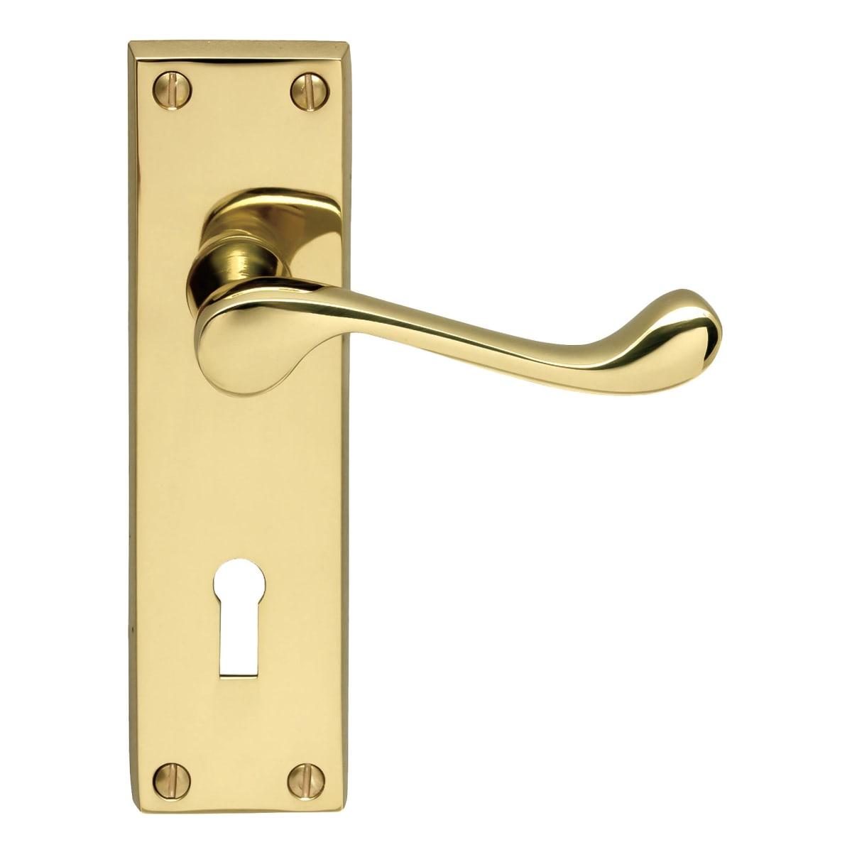 Carlisle Brass Victorian Polished Brass Scroll Lock Contract available in yellow colour it has a fire resistant handle that is suitable for interior and exterior doors. This Product measures 155 x 40mm (L x W). This door handle is slightly bent at the end to aid grip is fixed on a straight backplate with corners. The handle features a comfortable gently curved lever handle with smooth spring action. The plain rectangular backplate is a classic scroll lever with its clean and simple lines conveying its traditional heritage. It can be fixed with four screws at different corners and is suitable for versatile doors.