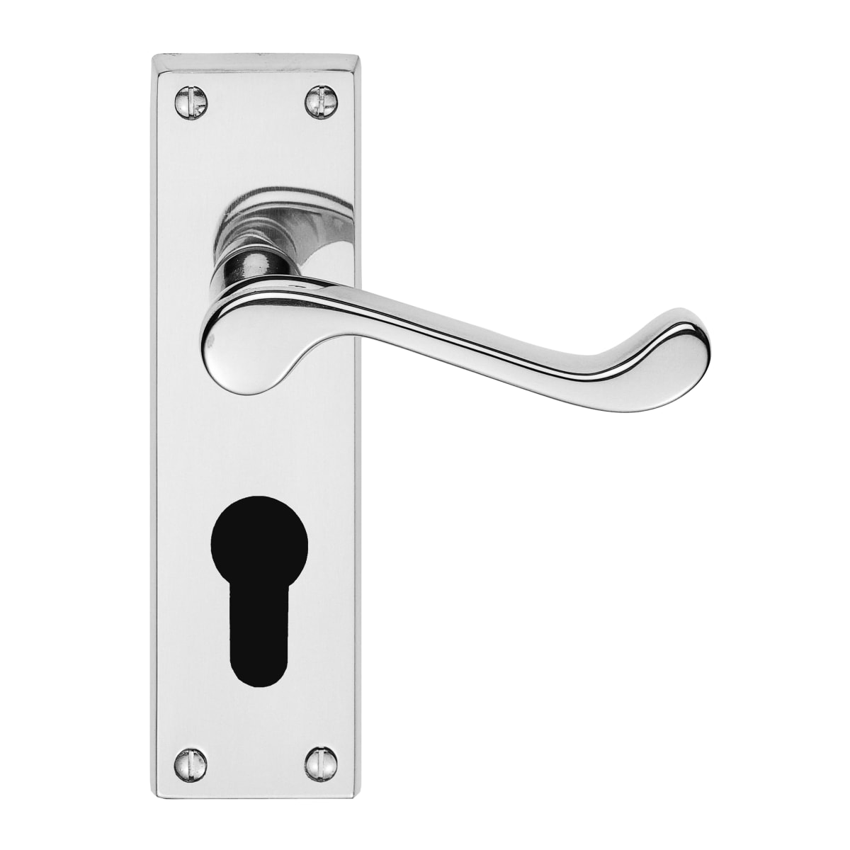 Carlisle Brass Victorian Scroll Lever on Euro Lock Backplate 150 x 43 x 10mm (H x W x T) Polished Chrome has four face fixing points. It is the straight lever on a rectangular backplate with end inserts top and bottom emphasizing the polished chrome finish. The Victorian style upturned handle lever is designed for easy and comfortable grip. The product is fire door rated.