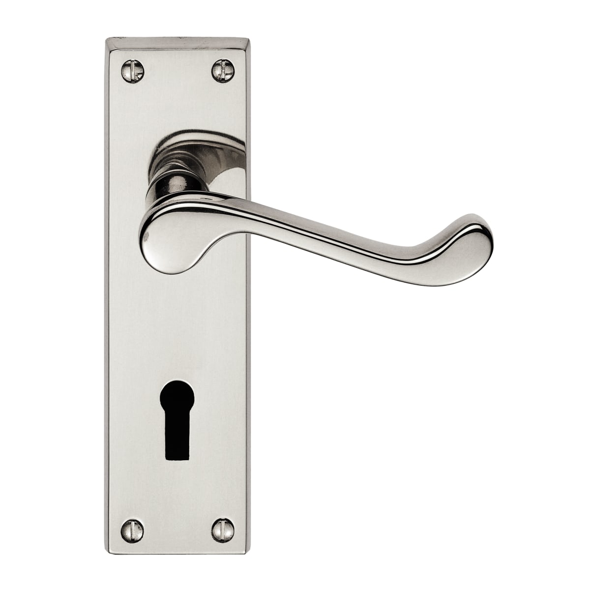 Carlisle Brass Victorian Scroll Lever on Lock Backplate 150 x 42 x 10mm (H x W x T) Polished Chrome has four face fixing points. It is the straight lever on a rectangular backplate with end inserts top and bottom emphasizing the polished chrome finish. The Victorian style upturned handle is designed for easy and comfortable grip. The product is fire door rated.