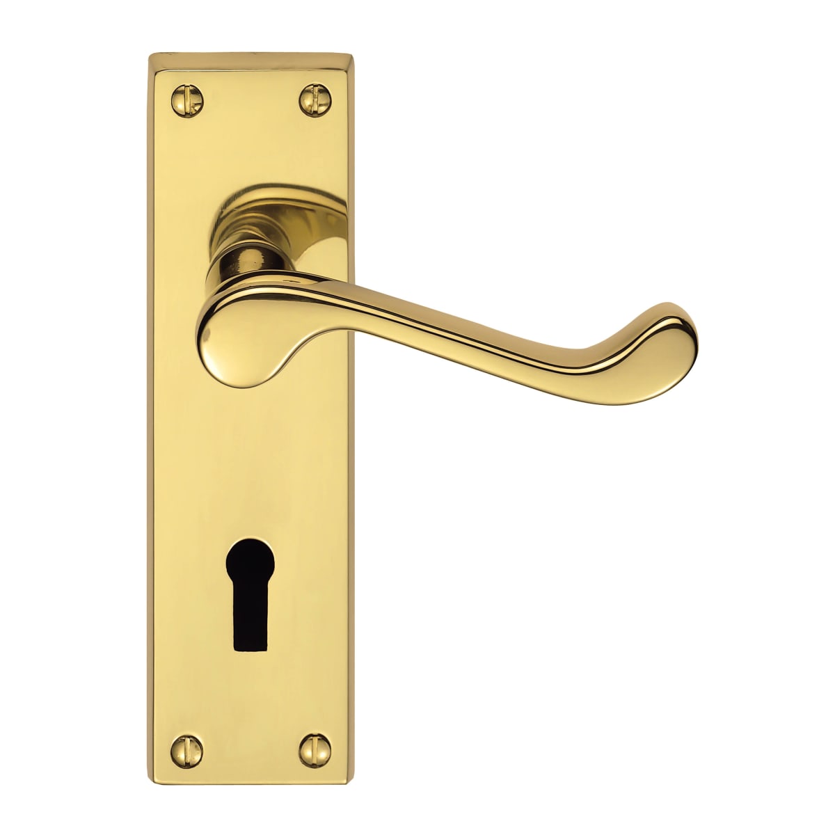Carlisle Brass Victorian Scroll Lever on Lock Backplate 150 x 42 x 10mm (H x W x T) Polished Brass has four face fixing points. It is the straight lever on a rectangular backplate with end inserts top and bottom emphasizing the polished brass finish. The Victorian style upturned handle is designed for easy and comfortable grip.