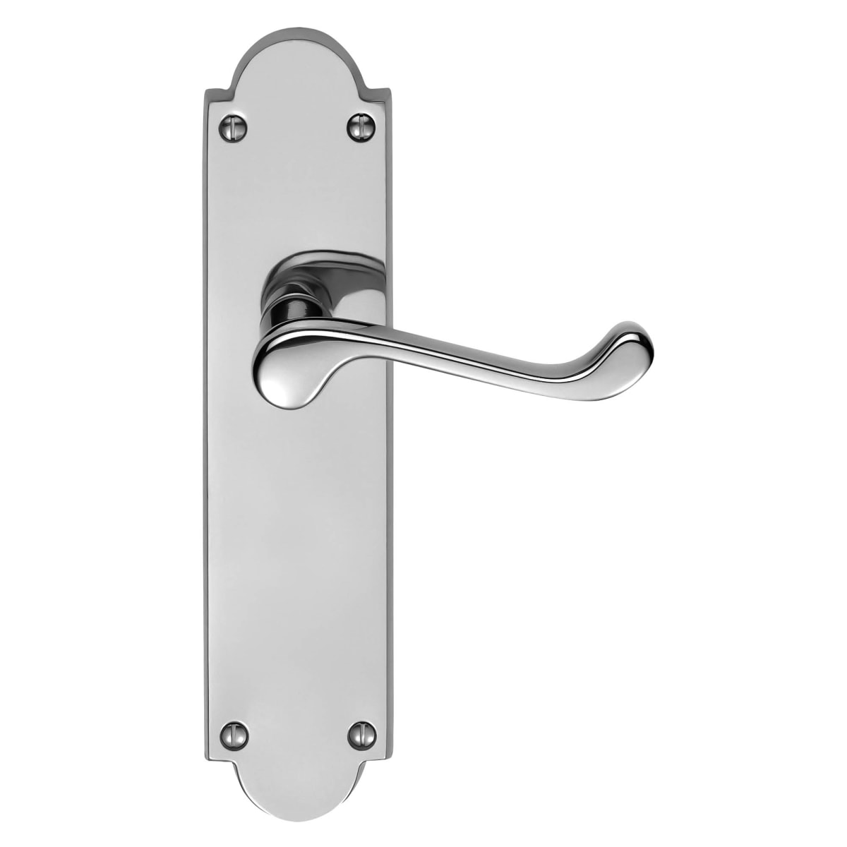 Carlisle Brass Victorian Scroll Lever on Shaped Latch Backplate 205 x 49 x 8mm (H x W x T) Polished Chrome has four face fixing points. It is the straight lever on a rectangular backplate with end inserts top and bottom emphasizing the polished chrome finish. The Victorian style upturned handle is designed for easy and comfortable grip.