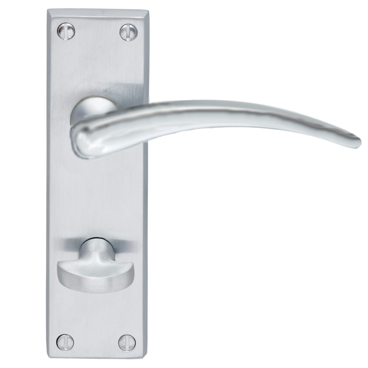An elegant slim and curved lever on a 150 x 43mm rectangular backplate for standard 57mm centres bathroom lock in a satin chrome finish.