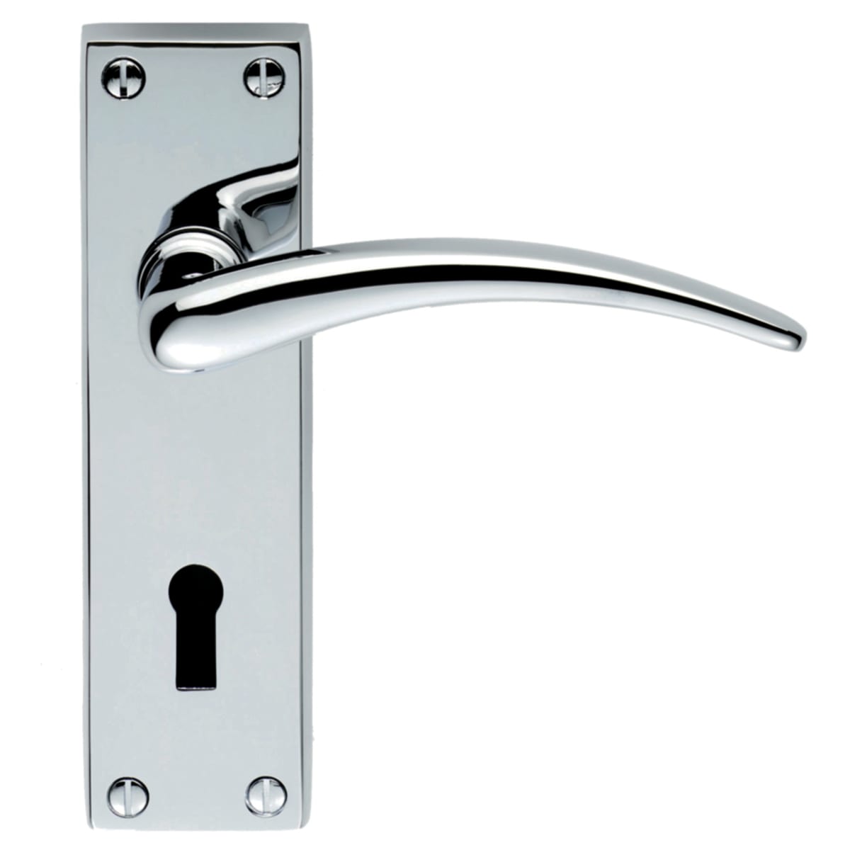 Carlisle Brass Wing Lever on Lock Furniture Polished Chrome is an elegant slim curved lever on a 150 x 43mm rectangular backplate. The backplate is modern in a minilistic style adorned by a handle which is arched and has a sleek curve which thins out towards the end. This ensures a comfortable ergonomically sound grip. Suitable for use in domestic settiings. For use with a standard 57mm centre sash lock. Can also be used with fire doors.