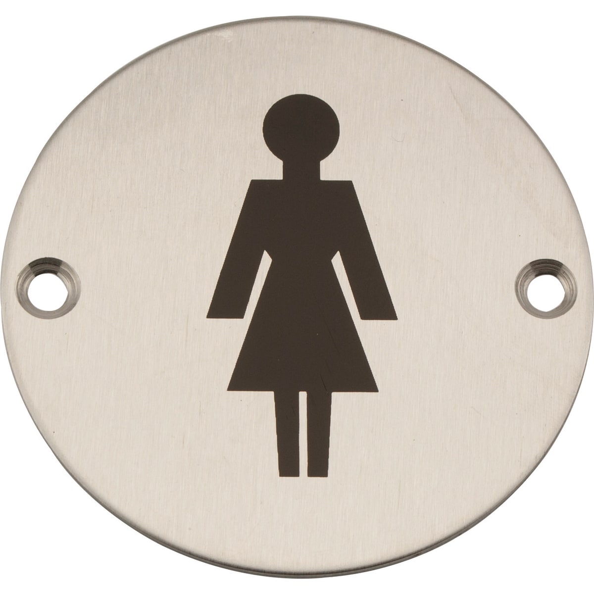 Frisco Female Symbol 76mm Diameter in a satin stainless steel finish is part of a range of safety symbols used to identify female rooms in premises. Supplied with fixings and tested to EN1634 FD 30, 60 and 240 minutes fire rated.