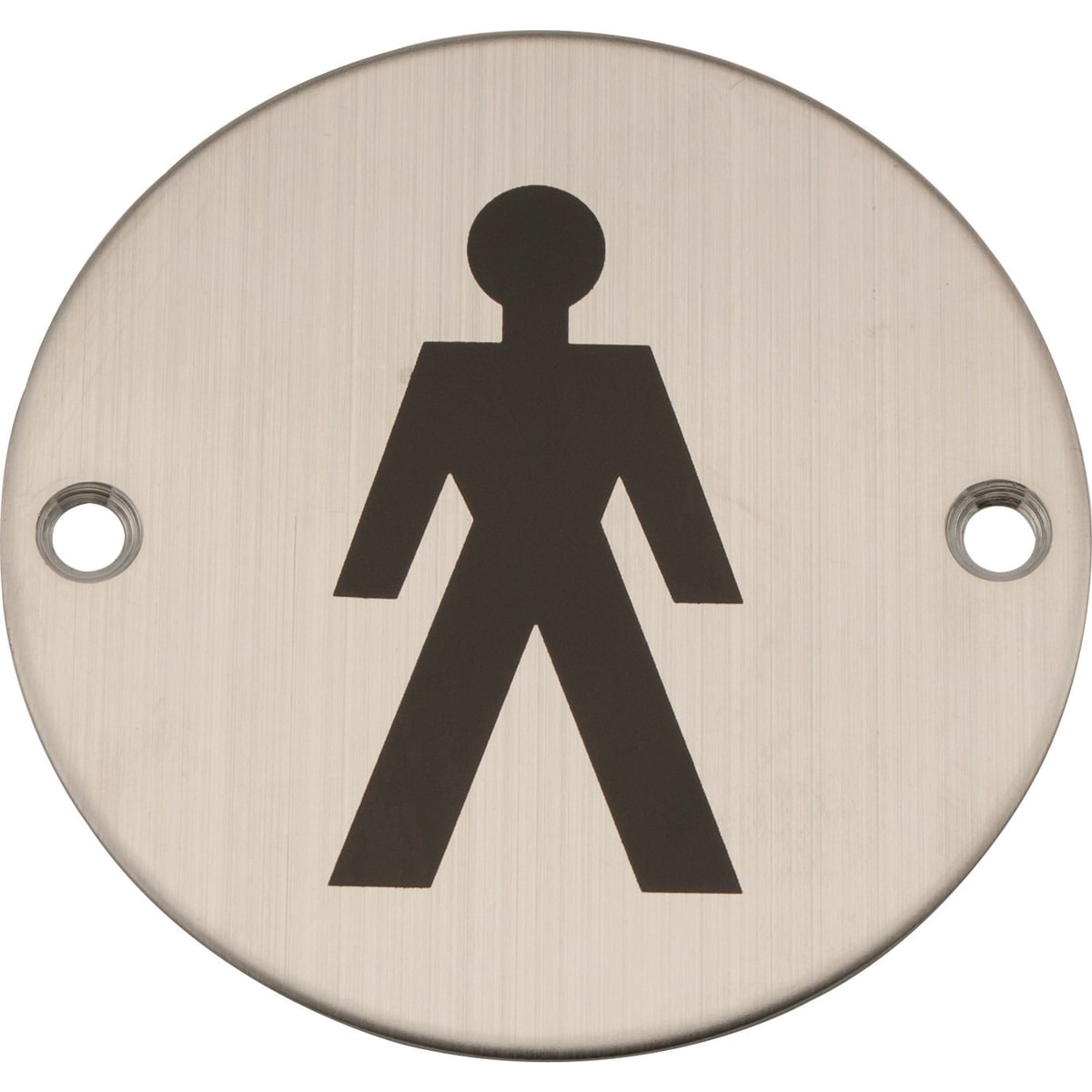 75mm circular Satin Stainless Steel face fix Male Symbol. Supplied with Fixings. EN1634 FD 30, 60 and 240 minutes fire rated