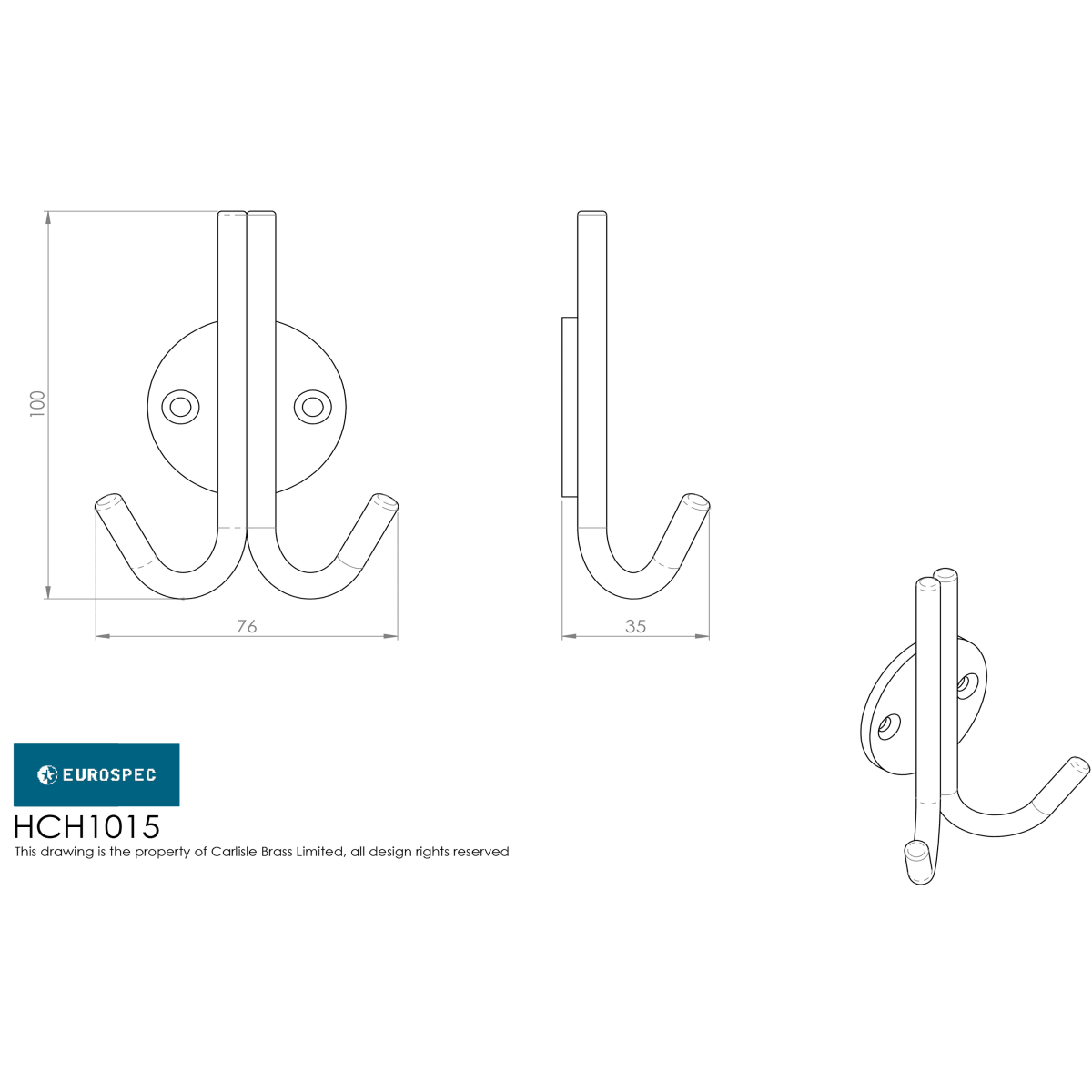 Eurospec Coat Hook Double is 10mm in diameter on a 47mm diameter rose with a projection 35mm that comes in a satin stainless steel.