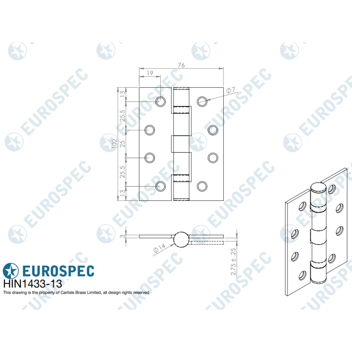 IDHWES0070 Hinges, Seals & Intumescent > Hinges > Fire Door GR13 Hinges > Eurospec Fire Door Hinge Square Edge Stainless Brass Pack of 2