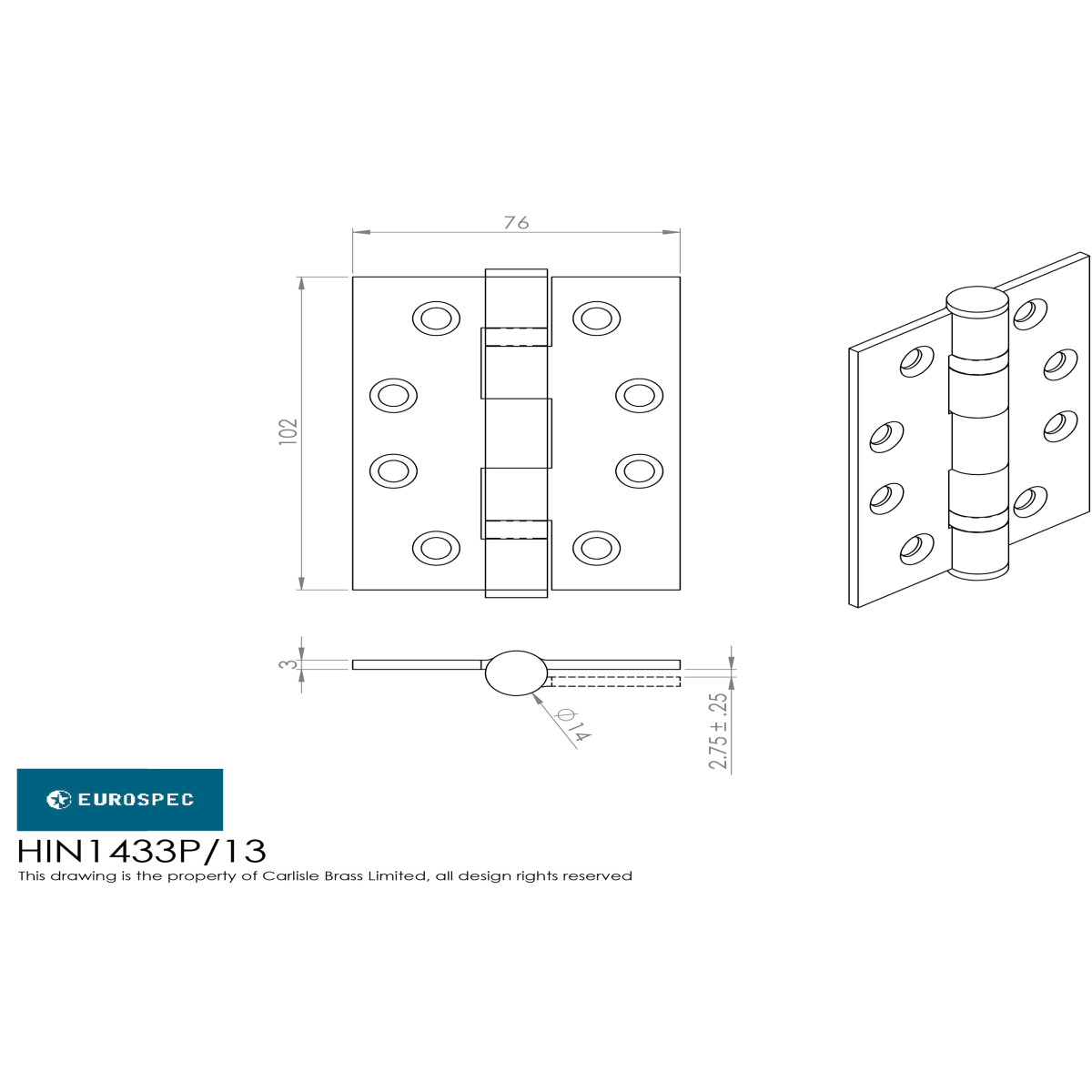 Product Name Eurospec Enduro Grade 13 Ball Bearing P Hinge 102 x 76mm Bright Stainless Steel