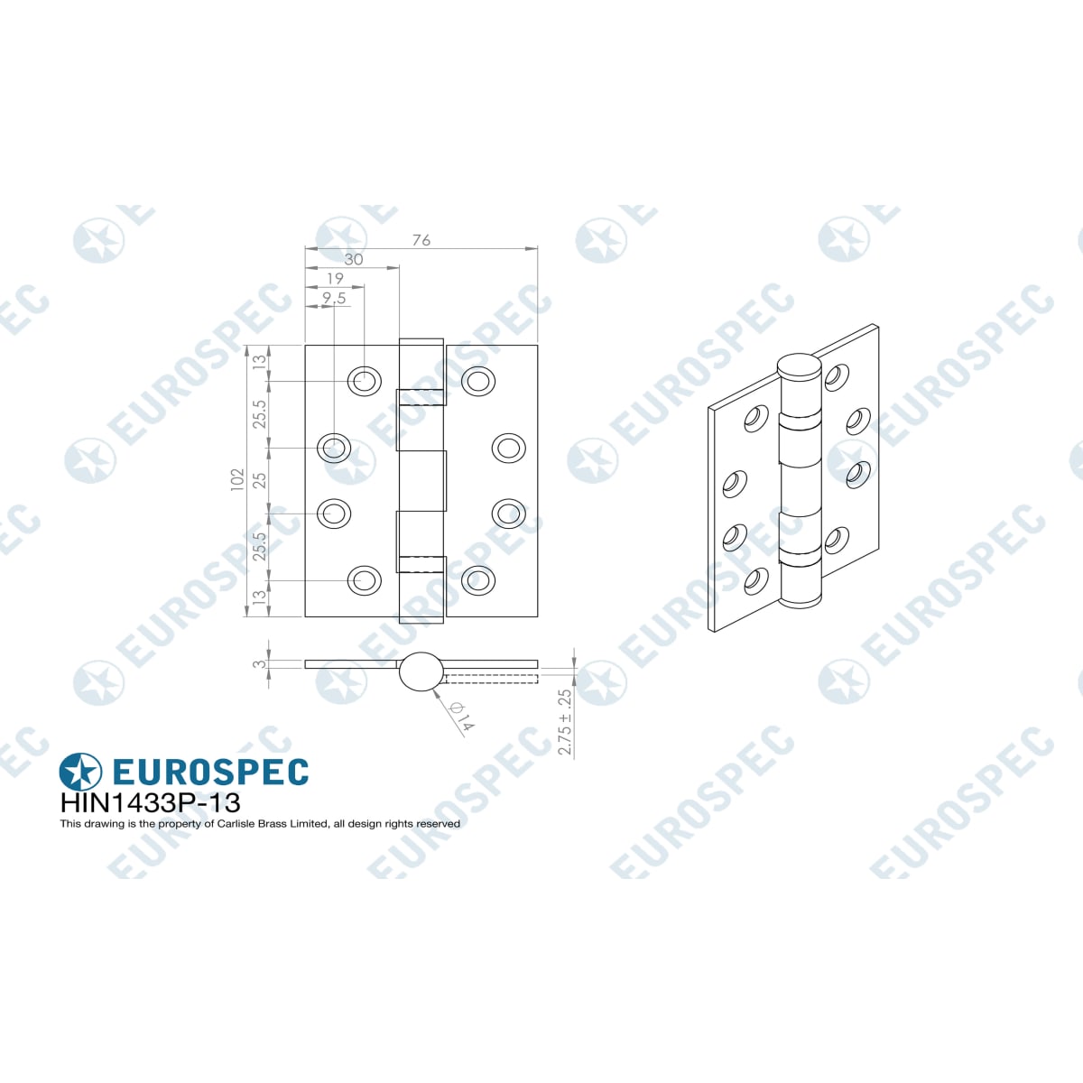 IDCH143SSS Hinges, Seals & Intumescent > Hinges > Ball Bearing Hinges > Eurospec Enduro Grade 13 Ball Bearing P Hinge Square 102 x 76mm Satin Stainless Steel
