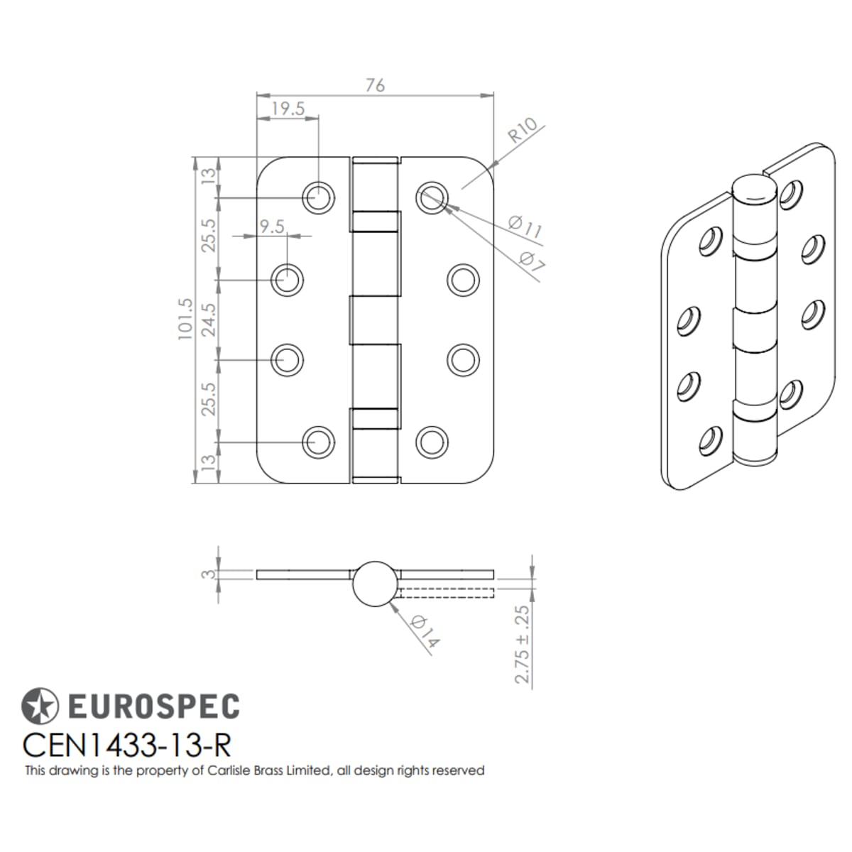 Ideal for external application, this pack of 2 Marine Grade Ball Bearing Fire Door Hinge is complete with a satin stainless steel finish. The dimensions are: 102 x 76 x 3mm with radius corners and a CE Grade 13, it is intended for doors up to 120kg. Tested to BS EN 1935.