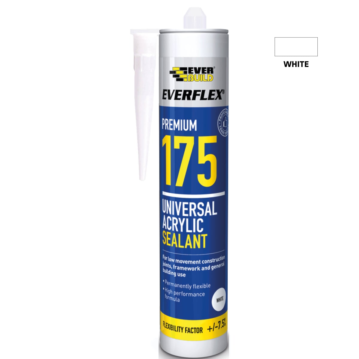 Everbuild Everflex 175 Universal Acrylic Sealant is an acrylic Sealant, suitable for internal and external use that provides a permanently flexible long lasting seal that adheres to virtually all materials. Contains anti-fungal agent to prevent mould growth in areas of high humidity, and can be overpainted.
