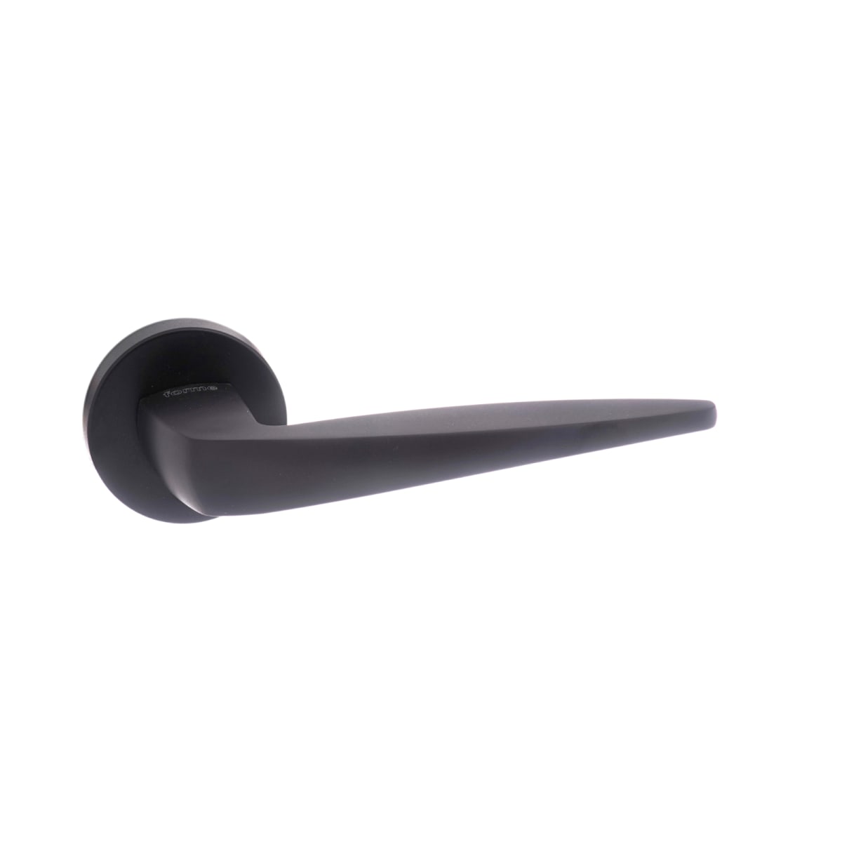 Forme Foglia Designer Lever on Minimal Round Rose Matt Black features a pointed handle design that can be paired with matching latches, deadlocks for a uniform look to any door. This product is part of the Forme Designer Lever Collection notable for it's ageless innovative designs.