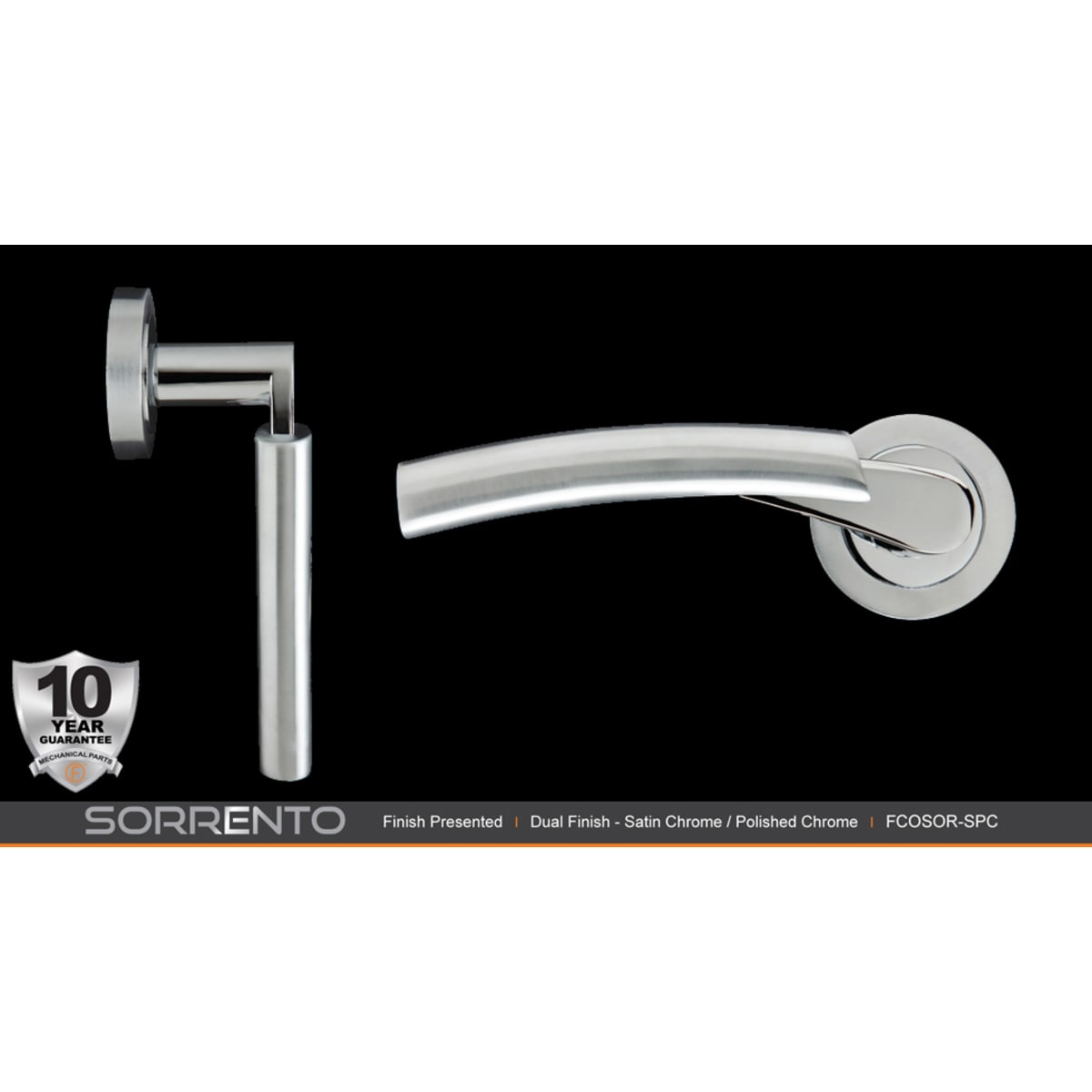 Fortessa Sorrento Lever Door Handles On Rose is a lever on round rose which is available in a satin/polished chrome finish that measures 135 x 51mm (L x Dia). The handle comes in a curved lever design which gives a modern look to any doors. The lever is made of high-quality zinc alloy material, providing a high-level of security. The