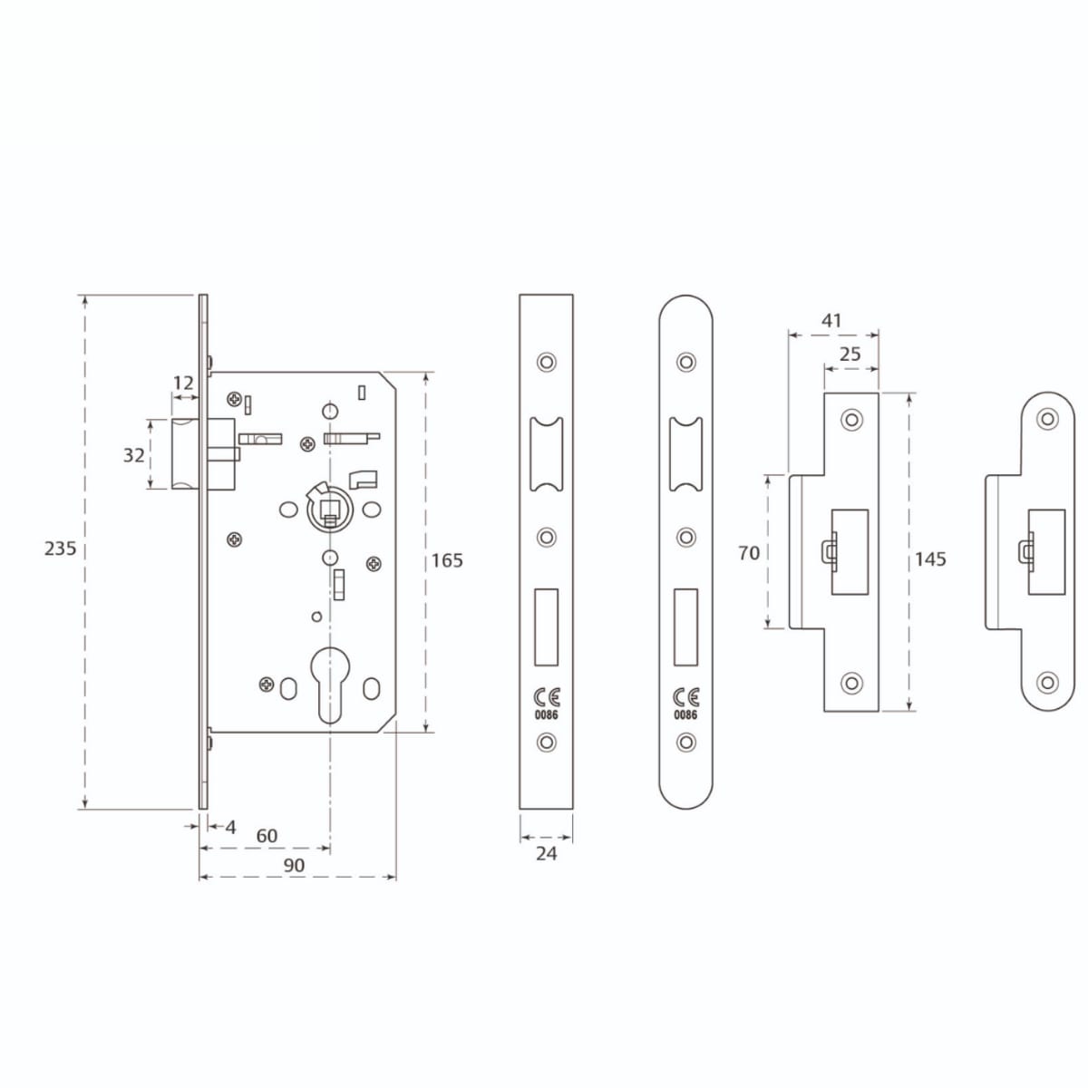 IDHWCB3035 Locks & Security > Locks, Latches & Cylinders > Latches, Deadbolts & Rebates > Union HD72 CE DIN Latch Square for end 60mm Backset Stainless Steel