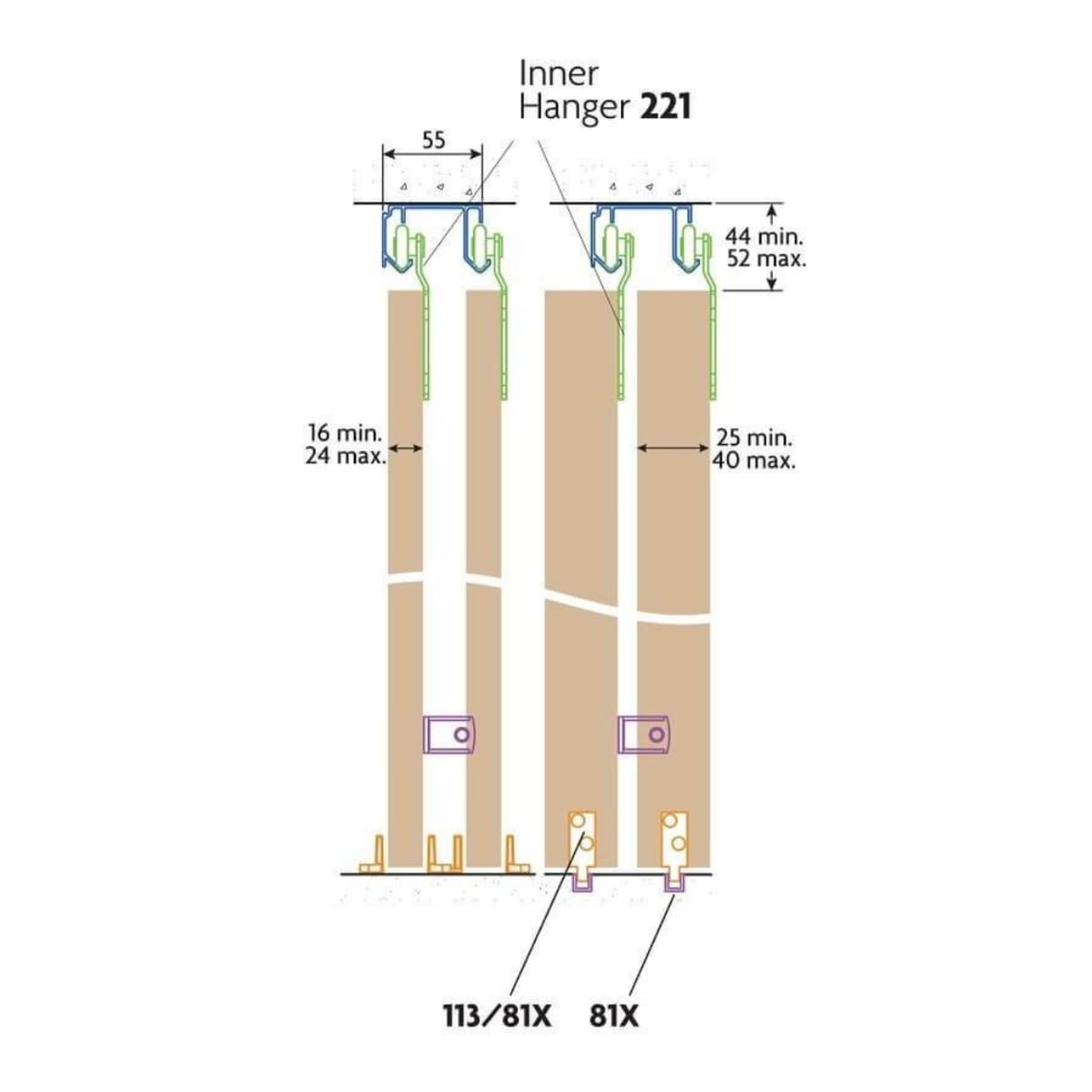 The double top sliding wardrobe door gear kit is perfect for heavy-duty wooden or composite sliding wardrobe and cupboard doors weighing up to 45kg. It is suitable for doors of 900mm wide and a maximum opening width of 1500mm using two doors. The kit contains one aluminium anti-rise soffit fixing track, two outer offset hangers, two inner offset hangers, one rubber buffered stop and one nylon guide. The door hangers can be reversed to accommodate door thicknesses from 16mm to 40mm. The kit is ideal for a wide range of double leaf, wood or composite sliding doors.
