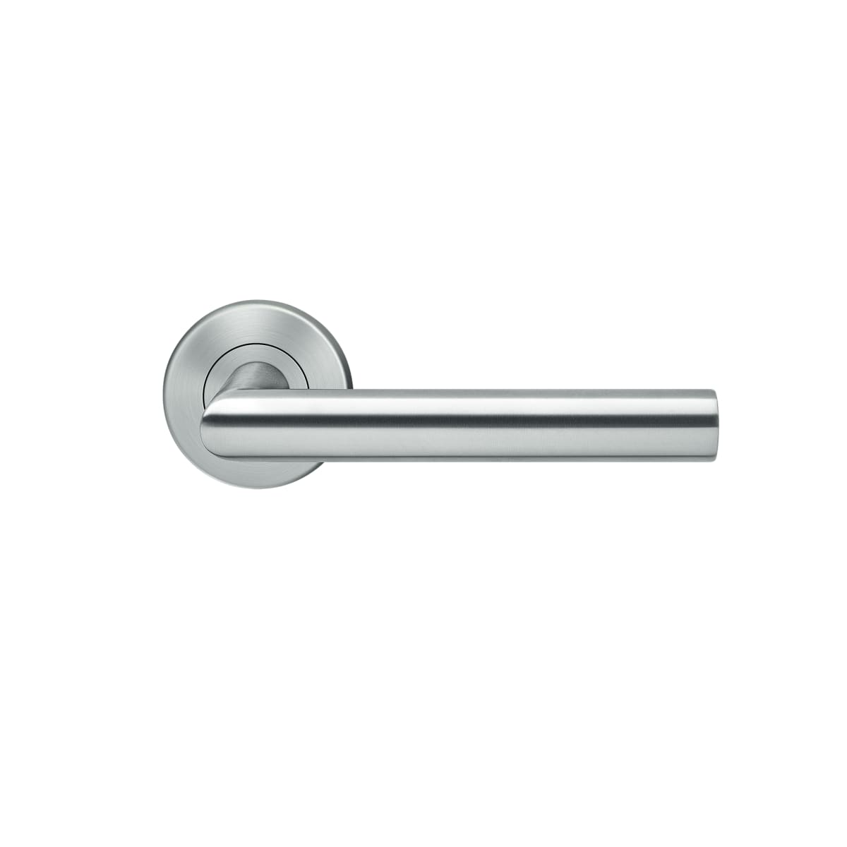Karcher Design K-Form Slim Style Lever on Round Rose Satin Stainless Steel is a high quality slim style mitred lever on clip on sprung rose. Matching bathroom turn and escutcheon available. Complete with bolt through fixings for extra security and strength. Length of lever: 19mm.
