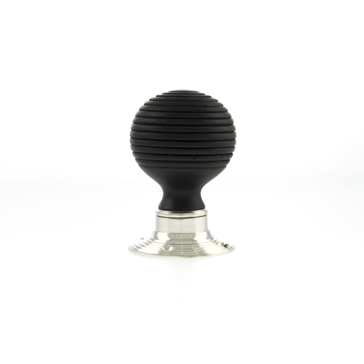 Product Name Old English Whitby Ebony Wood Reeded Mortice Knob on 60mm Face Fix Rose Polished Nickel