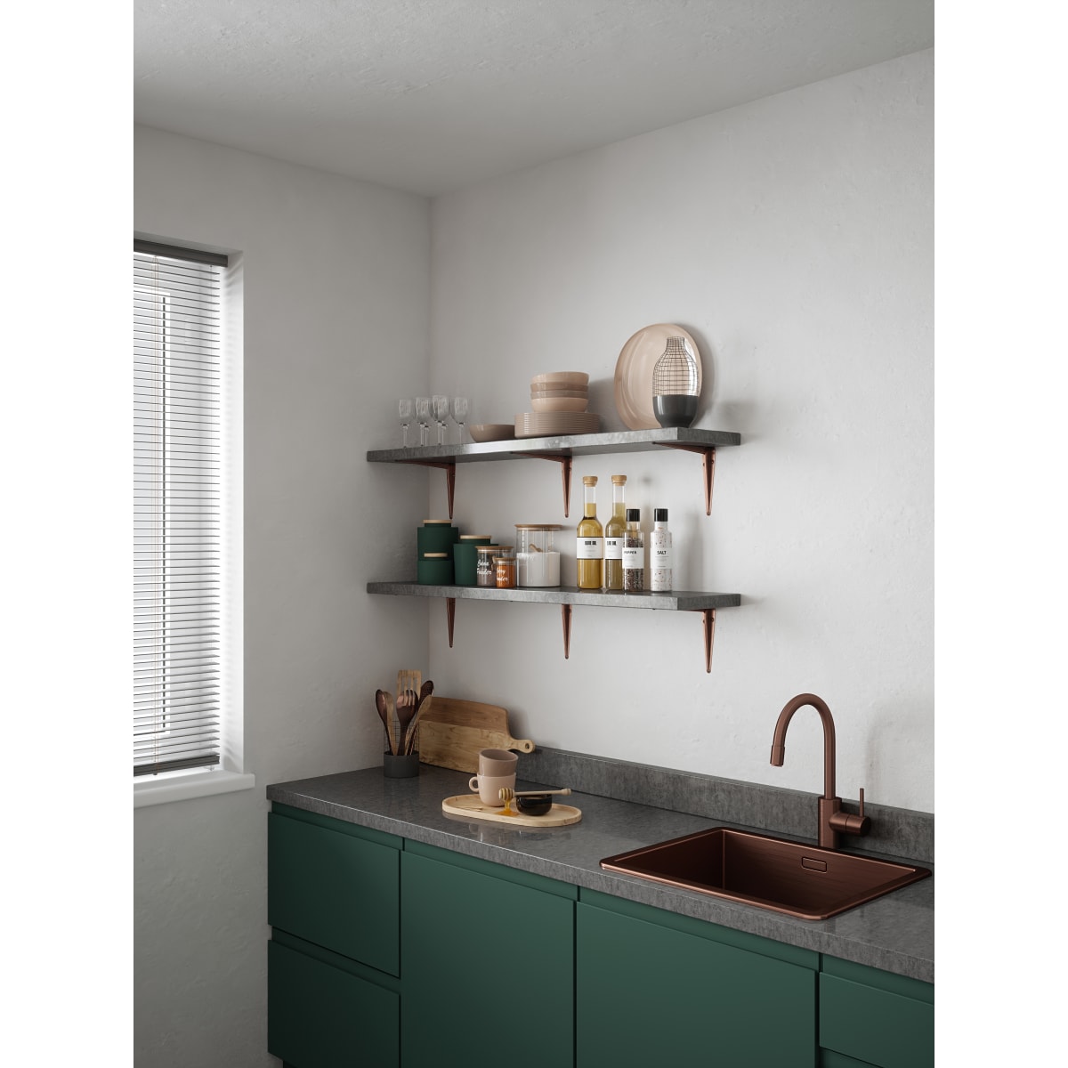 Rothley London Pattern Shelf Bracket 150 x 125mm (H x W) Antique Copper manufactured from heavy gauge mild steel. It locks the shelf to the vertical wall for added safety. The product keeps the shelves from being pushed up and unlocked accidentally. Ideal for use in a kitchen, home office, or other areas in the home providing a modern and stylish touch.