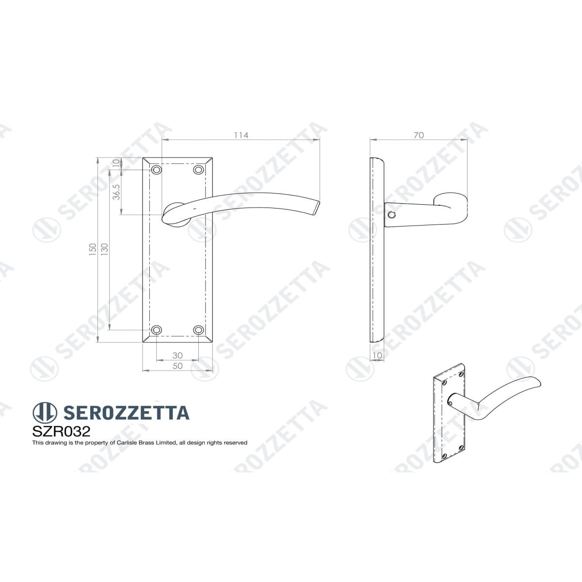 Lever on a chamfered edge rectangular latch backplate. An arched flat style lever with a smooth curved top. A simple elegant designer door handle, sleek and curved lines offer both comfort and visual appeal. Part of the Serozzetta Residential range. Comes with a 10-year mechanical guarantee.