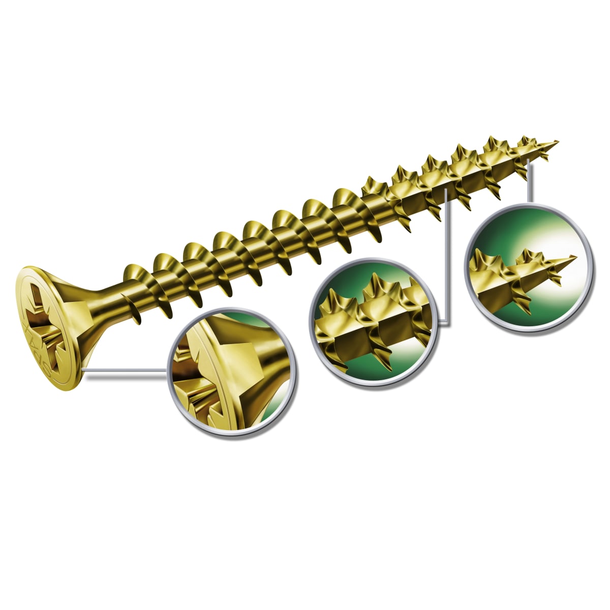 SPAX 5.0 x 60mm universal use woodscrews recommended for indoor projects. 100 screws in the pack. YELLOX coated - achieves greater corrosion protection compared to blue zinc plating. No pre-drilling required (wood dependant). 4CUT point ensures exact screw positioning, reduces splitting, reduces the screwing-in torque required to fix. Countersinks easily. Mills into the wood - stops on metal! Quick & secure fastening with the PZ2 driver bit recess.
