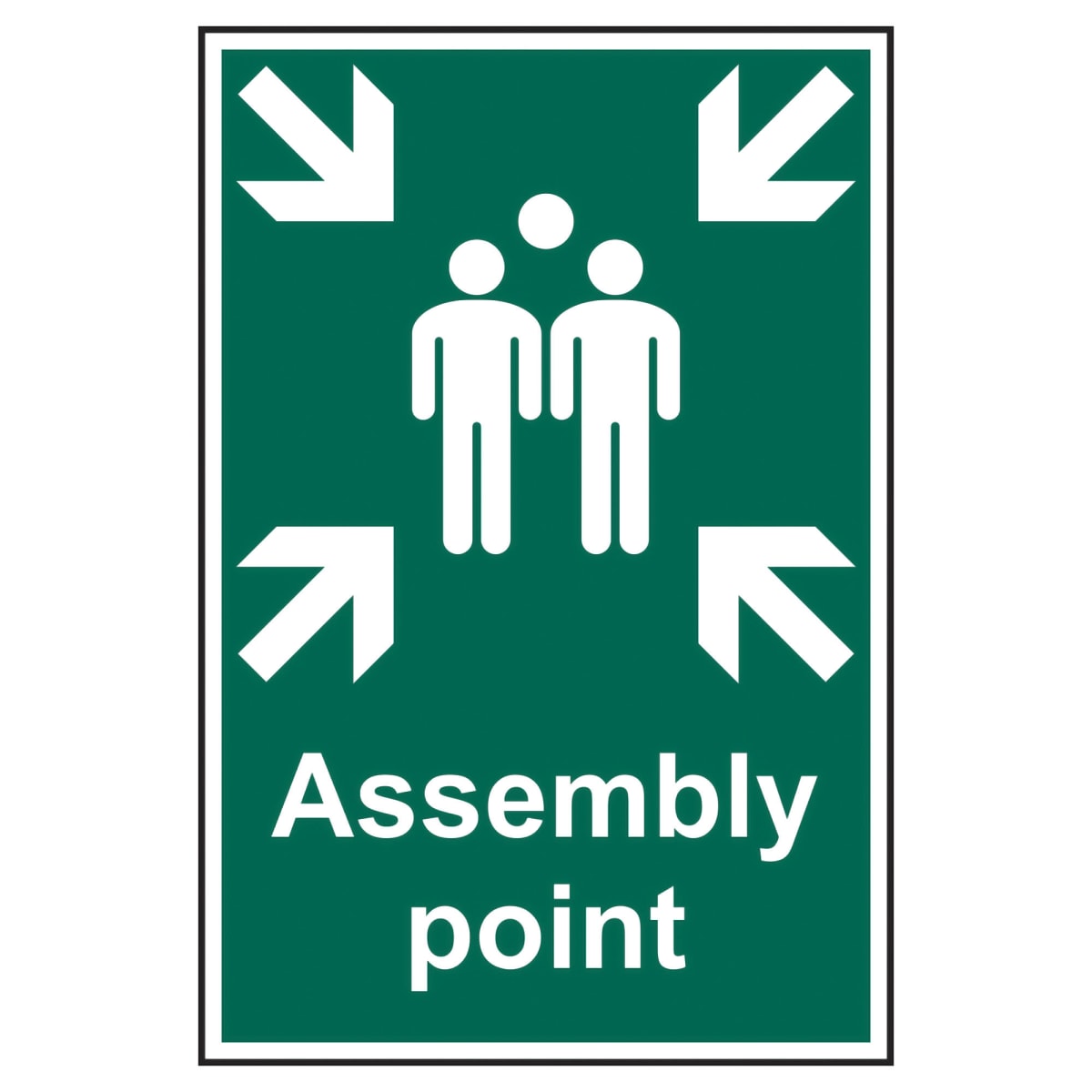 Assembly Point' is a 200mm x 300mm fire assembly sign. This sign is a self-adhesive semi-rigid PVC making it easy to apply to a clean dry surface.