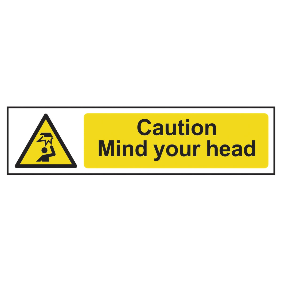 Caution Mind Your Head' sign is a 200mm x 50mm hazard warning sign made from self-adhesive semi-rigid PVC making it easy to apply to a clean dry surface. All signs conform to the BS EN ISO 7010 regulation, ensuring that all graphical safety symbols are consistent and compliant.