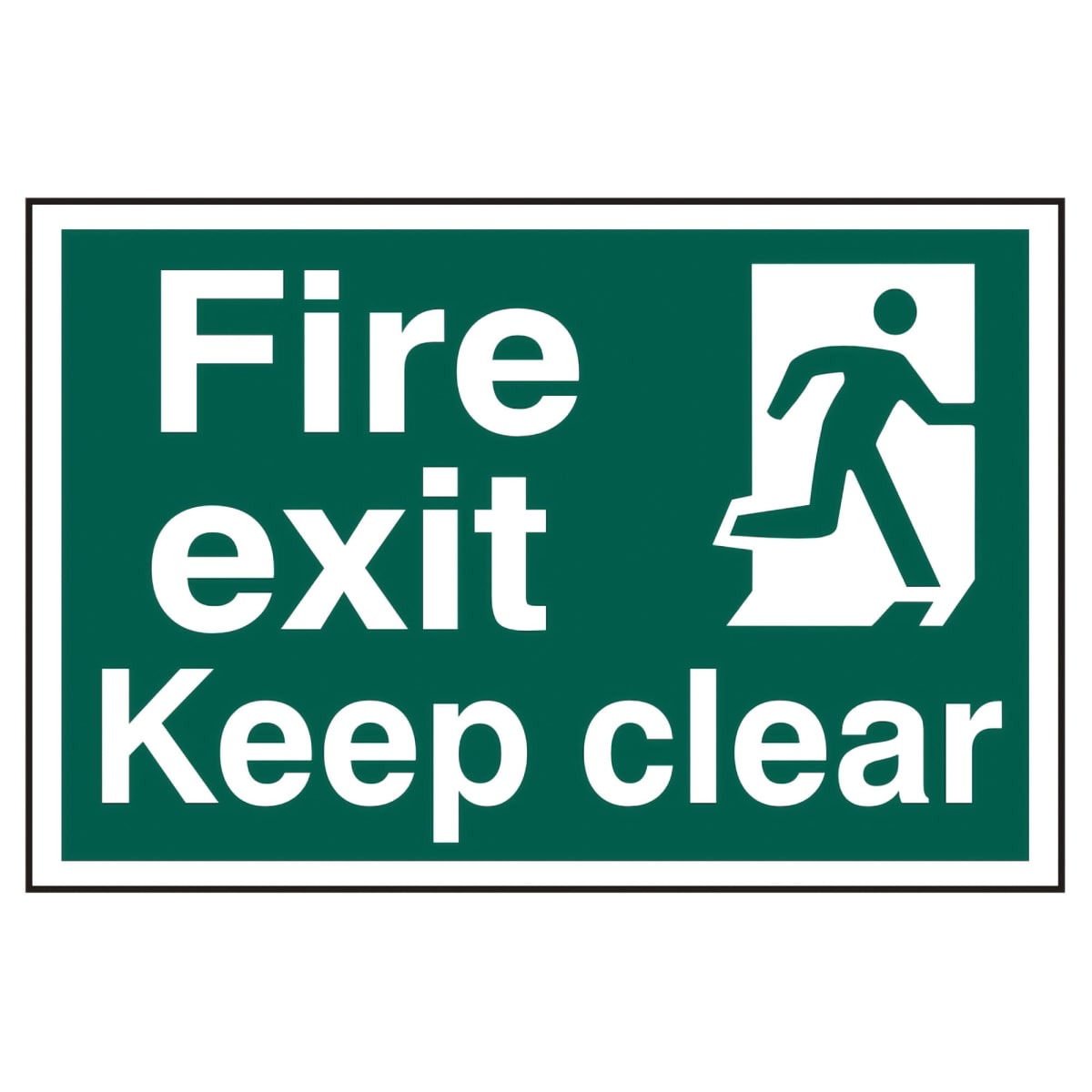 Fire Exit Keep Clear' is a 300mm x 200mm safety instruction sign. This sign is a self-adhesive semi-rigid PVC making it easy to apply to a clean dry surface. All signs conform to the BS EN ISO 7010 regulation, ensuring that all graphical safety symbols are consistent and compliant.