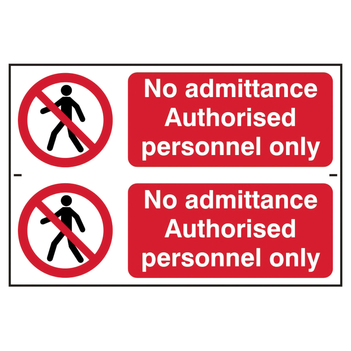 No Admittance Authorised Personnel Only' sign is a 300mm x 100mm restricted access sign. Featuring 2 on a sheet that can be cut into individual signs. Made from self-adhesive semi-rigid PVC making it easy to apply to a clean dry surface. All signs conform to the BS EN ISO 7010 regulation, ensuring that all graphical safety symbols are consistent and compliant.