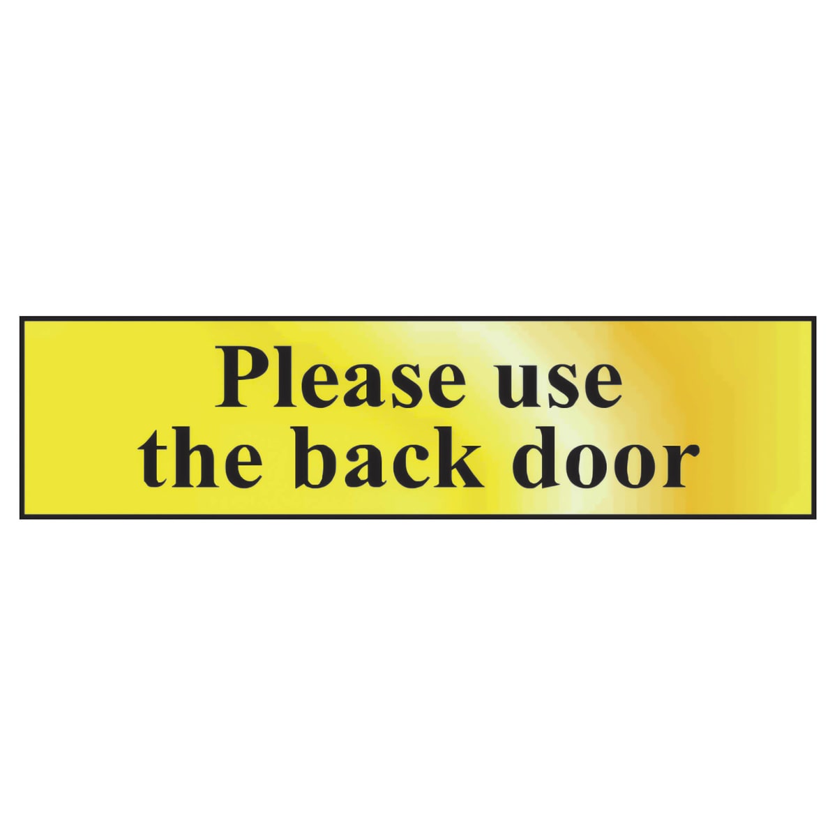 IDLISS6049 Tools, Equipment & Signage > Signage > Door Signs > Please Use The Back Door' Sign, Polished Gold Effect 200mm x 50mm