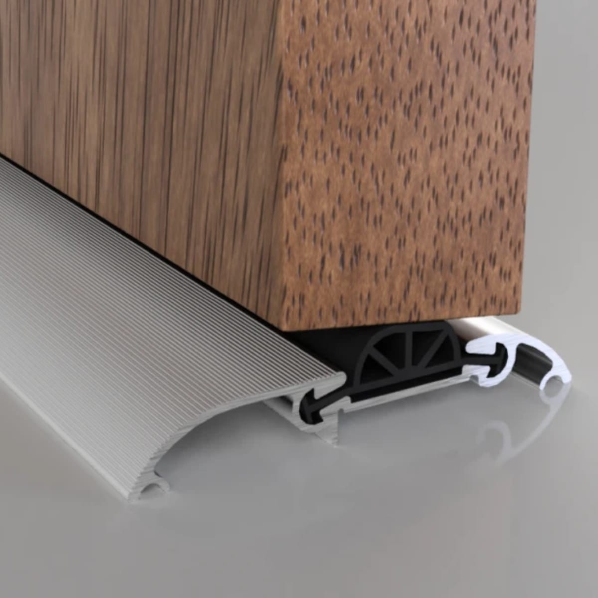 CDX low profile threshold suitable for both inward and outward opening doors with centre rubber seal. Designed to fit onto a subsill or finished floor level. Seals under door gaps of 15-18mm. Ideally suited for doors that are protected from severe weathering. Available in sizes 914mm, 1219mm, 1828mm in mill finish aluminium and 914mm in gold effect finish aluminium.