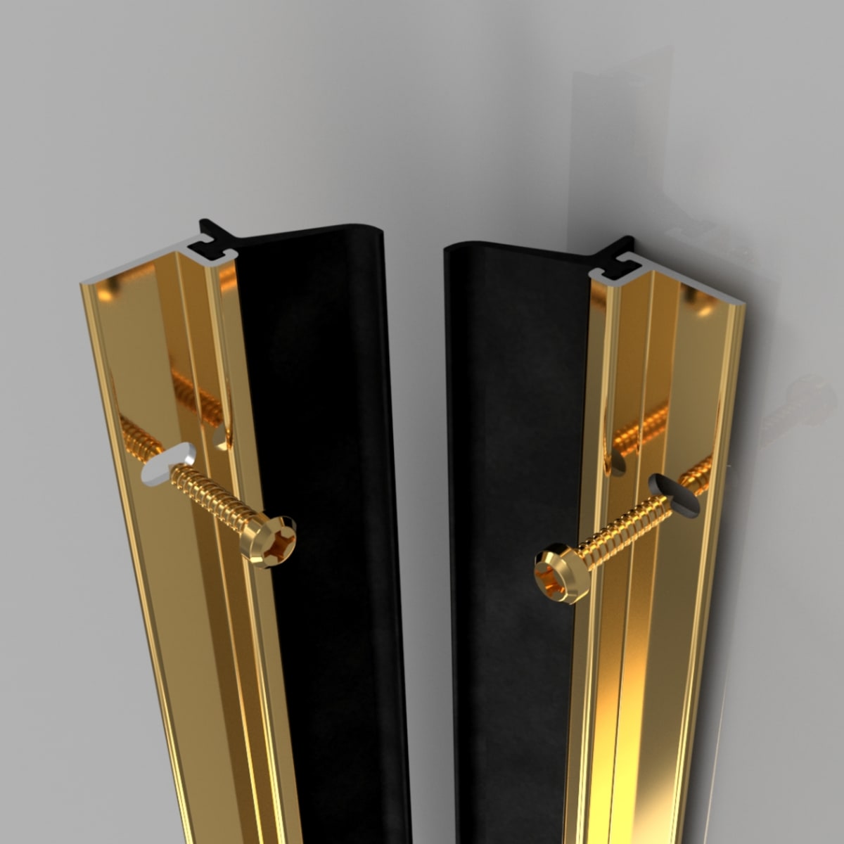 Heavy duty around door seal set with aluminium carrier and nitrile rubber draught proof strips. Seals gaps up to 10mm around inward opening doors to protect against rain and draught intrusion. Wind pressure increases the efficiency of the system. Can be used as a ‘cold smoke seal’. Available in sizes 2100mm & 2430mm in mill finish aluminium and gold effect finish aluminium with pin fixing.