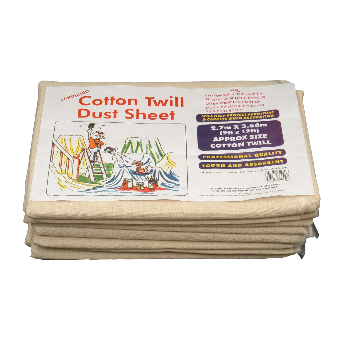 Tarpaflex Laminated Dust Sheet 3.6 x 2.7m (L x W) is ideal for protecting furniture and floors while decorating. Manufactured from hardwearing cotton that offers excellent absorption and protection. It is used to protect surfaces from dust, paint, plaster when carrying out building work.