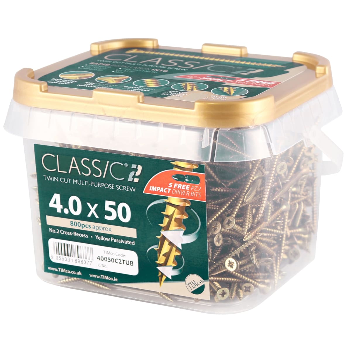 TIMCO Classic C2 Screw 50 x 4mm (L x Dia) Box of 800 is zinc yellow passivated with a multi-purpose cross recess. It has a 25 degree sharp point and is a fully threaded screw for ease of installation. This screw is manufactured from steel and suitable for use with wood, plasterboard and sheet materials. Re-engineered using the most modern manufacturing methods and design techniques, the C2 is a revolutionary high performance multi-purpose screw.