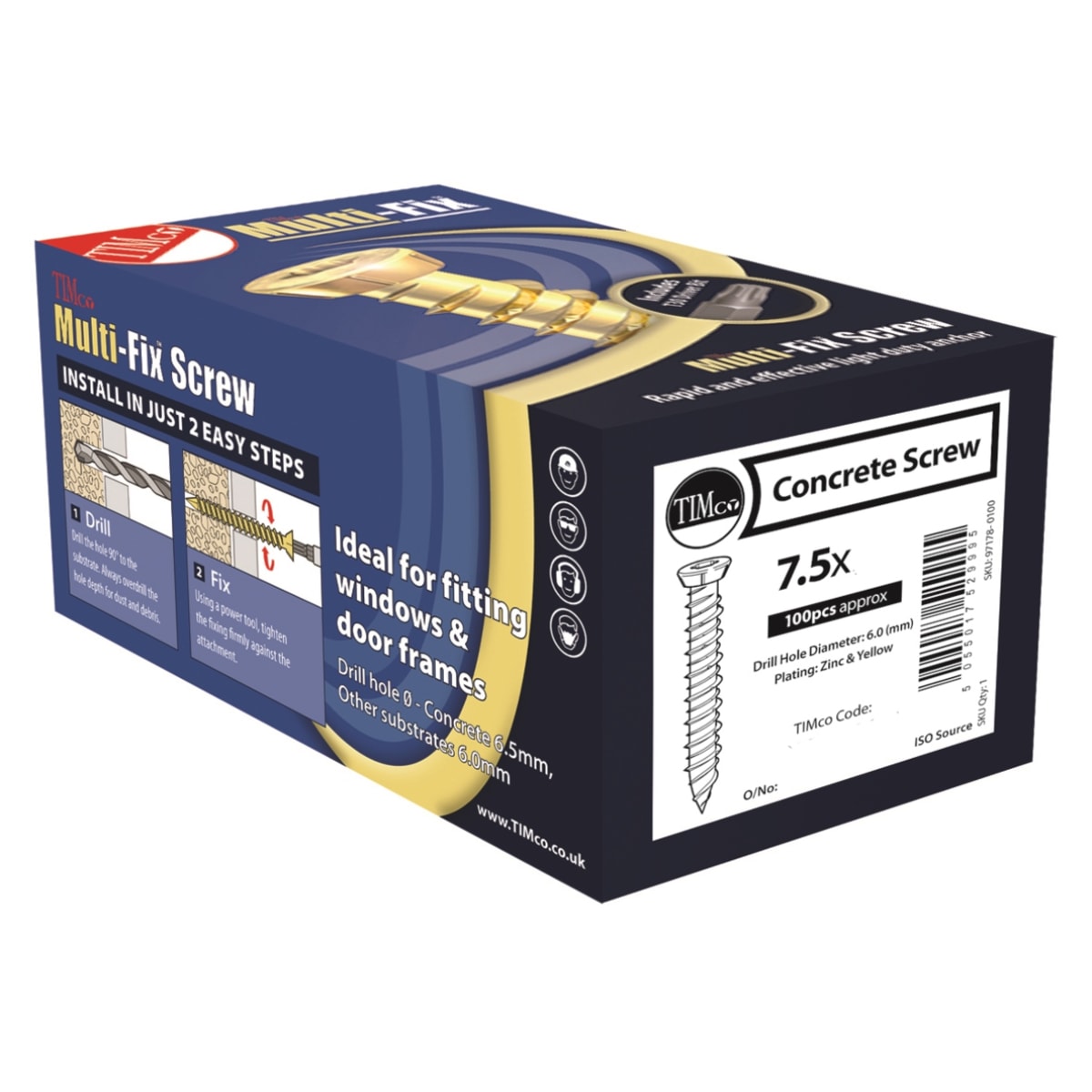 Product Name TIMCO Multi-Fix Concrete Screws 200 x 7.5mm Zinc Yellow Passivated Box of 100