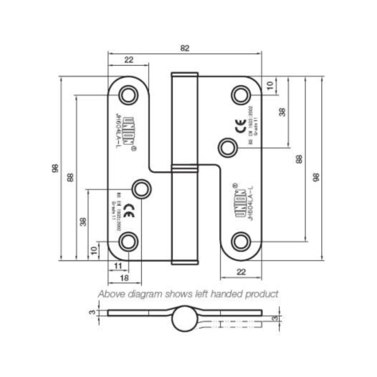 IDJH64RSSF Hinges, Seals & Intumescent > Hinges > Fire Door GR13 Hinges > Union 604 Powerload Lift Hinge RH Radius Corner Satin Stainless Steel 98mmx 82mm X 3mm