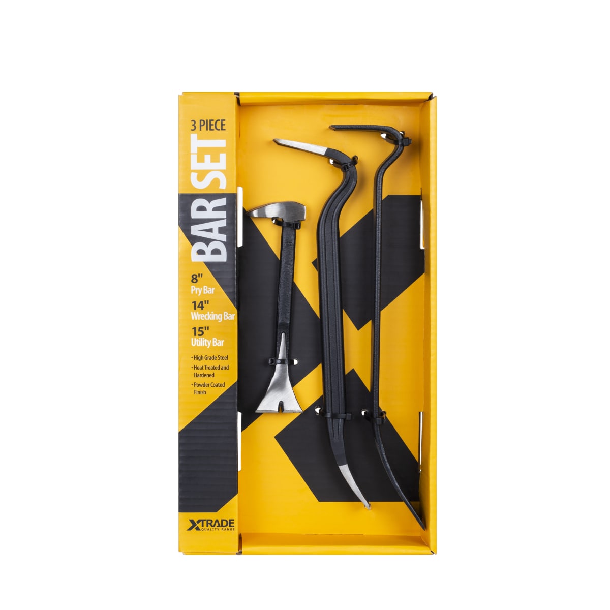 XTRADE Bar Set features high quality products that can lever, pry, used for demolition, removing nails and much more. The set contains a 230mm (8") Pry Bar, 355mm (14") Wrecking Bar, 380mm (15") Utility Bar.